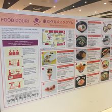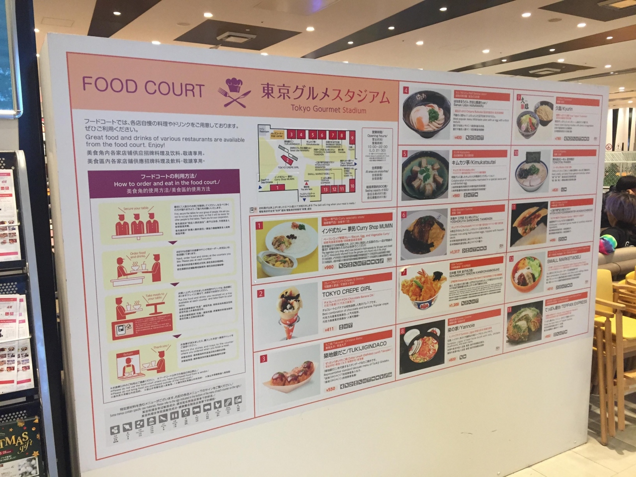 ダイバーシティ東京プラザのフードコートです。粉も、ラーメン、丼ものといったフードコートでは定番の店舗が揃っています。丼ものでは日本橋の有名店、金子半之助もありました。あと、たいめいけんなんかも。客席は相当に広くて、ある程度の混雑なら座れないということはなさそうです。客層は外国人も多い印象でした。その為か、フードコートの利用方法を外国語で記した案内がありました。