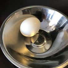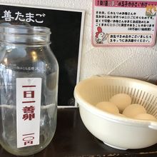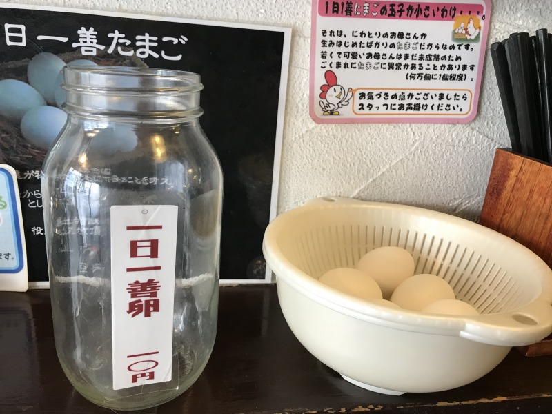 テーブルの横には「一日一膳たまご」があって1個10円。小さめのゆでたまごですが、にわとりのお母さんが生みはじめたばかりのたまごとのこと。