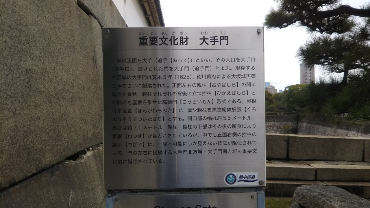 大阪城周辺の戦跡調査の際に立ち寄りました。大手門は大阪城の南西側に位置する大きな門で、大阪城の表門になるそうです。現存する大手門は1628年に徳川幕府によって再興されたものとの事で、かなり歴史的価値がありそうです。非常に重厚な門で、見ごたえがありました。門の左右の石垣に使われている石は非常に整った形をしており、またサイズもとても大きく、さすが正門!といった感じを受けました。見ごたえありますよ。