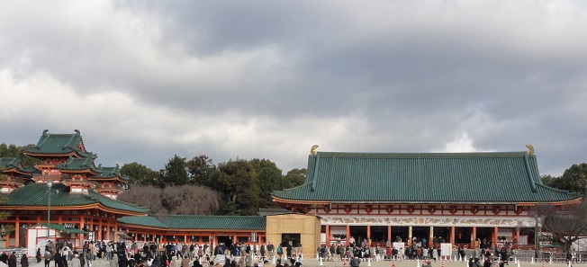 境内がとても広く、参拝者が多くても緩やかにお詣りできます。混雑が苦手で初詣の行先を迷っている方にはおすすめです。手水舎で手水を済ませ参拝に向かいますが、大極殿での参拝直前だけは若干の列ができます。参拝後は参道の両側に多くの露店が並んでいるので見て歩くのも楽しいです。大鳥居のそばのバス停から京都駅行のバスに乗りましたが交通渋滞はなく快適でした。