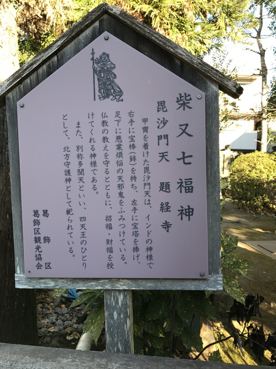 柴又帝釈天の毘沙門天は甲冑を身に付けており、インドの神様であり右手には宝棒を持ち左手には宝塔を掲げていて、足元には悪業煩悩の天邪鬼をふみつけている神様であります。仏教の教えを守るとともに招福、財福を招いてくれる神様です。