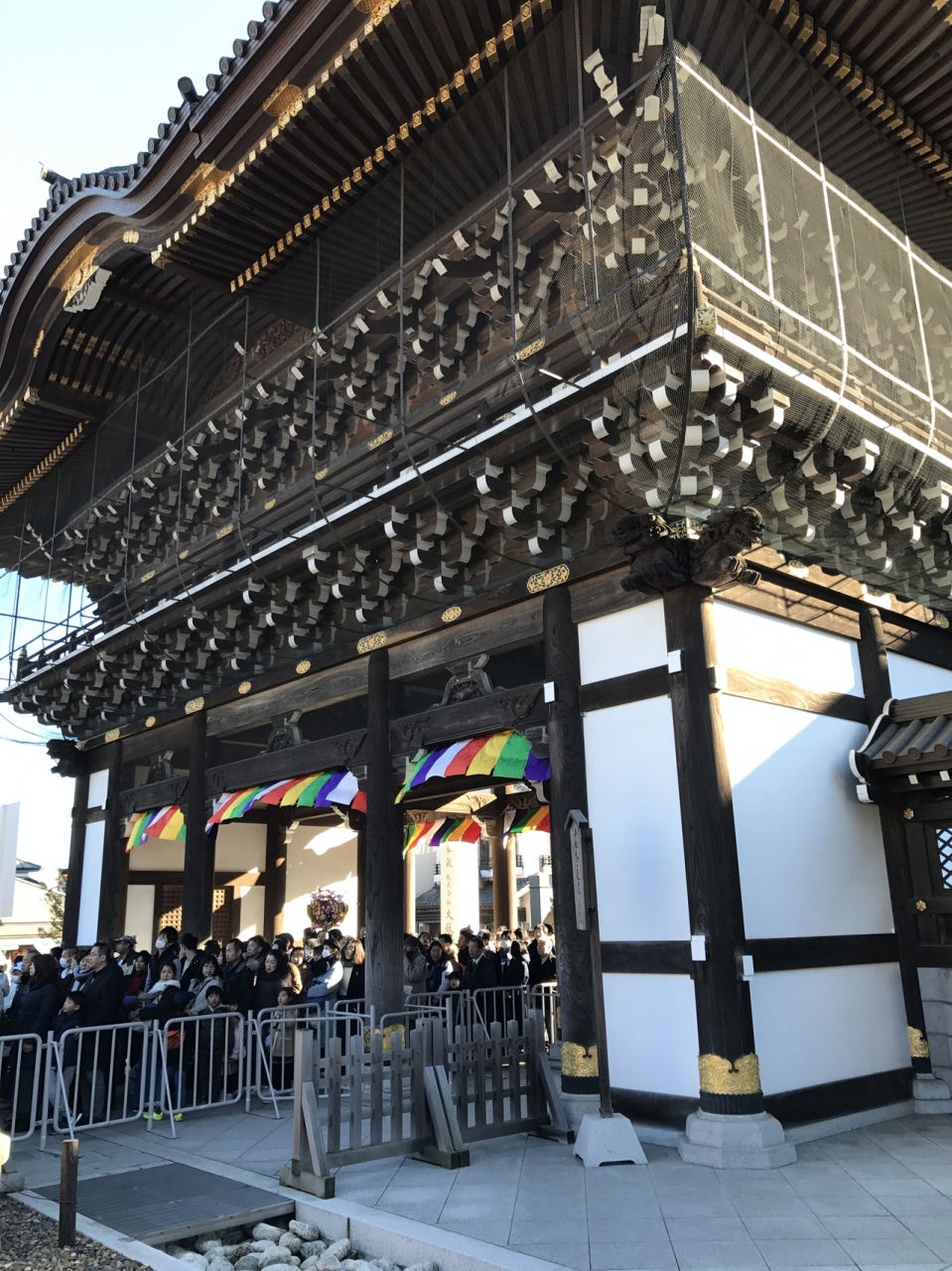 成田山の総門は、今の門は平成19年11月に建立されたものであります。総門とはお寺の一番外側にある正面の門です。一階部分には屋根が無いつくりであり、門の形式では五間三戸の桜門であります。成田山でも目立ちます。