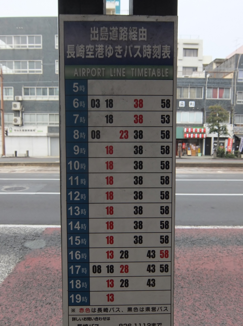 長崎空港と長崎市内を結ぶバス。2枚回数券は1600円で、車内で販売している。一人で往復使用しても、2名で一緒に利用してもOK。市内発のバスはいくつかの停留所を回っていくけど、結構混んでいて、補助席を利用しても乗り切れず、次のバスに回される人もいた。