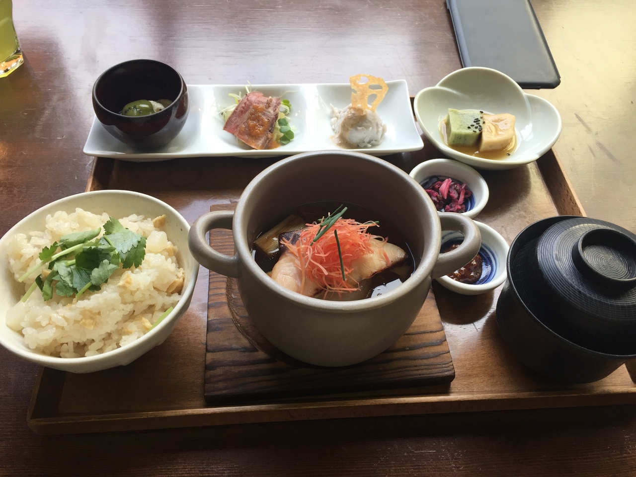 12時ちょい前に入店。店内はほぼ満席で、カウンター席にかろうじて空席があった。IYEMON御膳1,500円を発注。190円追加すると、月替のご飯に変更可能。なかなか繊細なお味だったが、おぢさんには量がやや物足りない感。