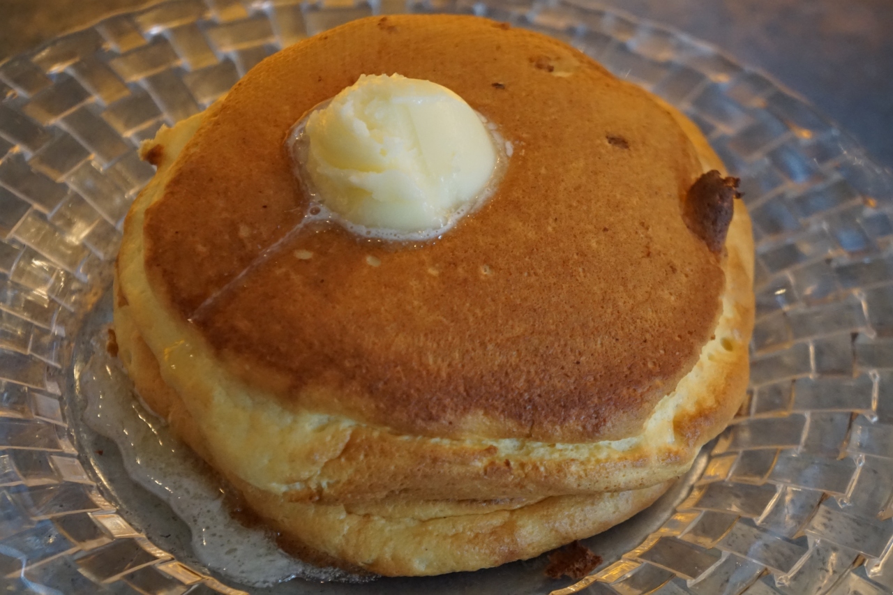 私は、カフェの方で評判のホットケーキをいただいてみました。何も付けずにおいしいということでしたが、たっぷり入ったバターの塩味が効いていて、その味なのかなと思います。ふわふわの食感もまあまあですが、驚くほどのうまさかというとそうでもないような。やっぱり、この雰囲気こそが値打ちだと思います。
