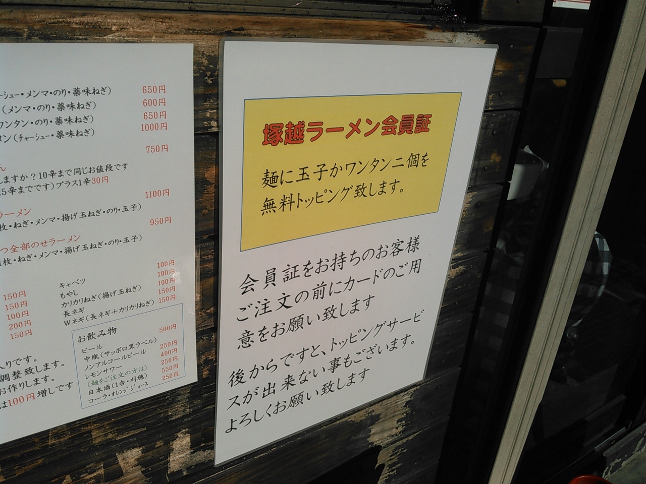 こってり系のラーメン屋です。特定曜日にお得なメニューがあります。それは、毎週月曜、火曜、木曜日の昼11時半から午後8時まで、肉なしラーメンとワンタンメンがワンコインの500円です。また、塚越ラーメン会員証で麺に玉子かワンタン二個を無料トッピングのサービスがあり、また、辛辛ラーメンという辛いラーメンがあったり工夫をしています。