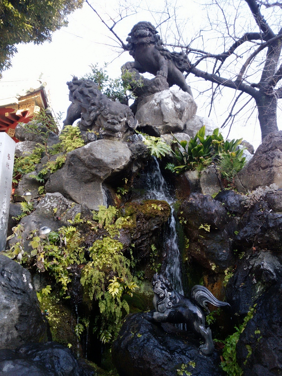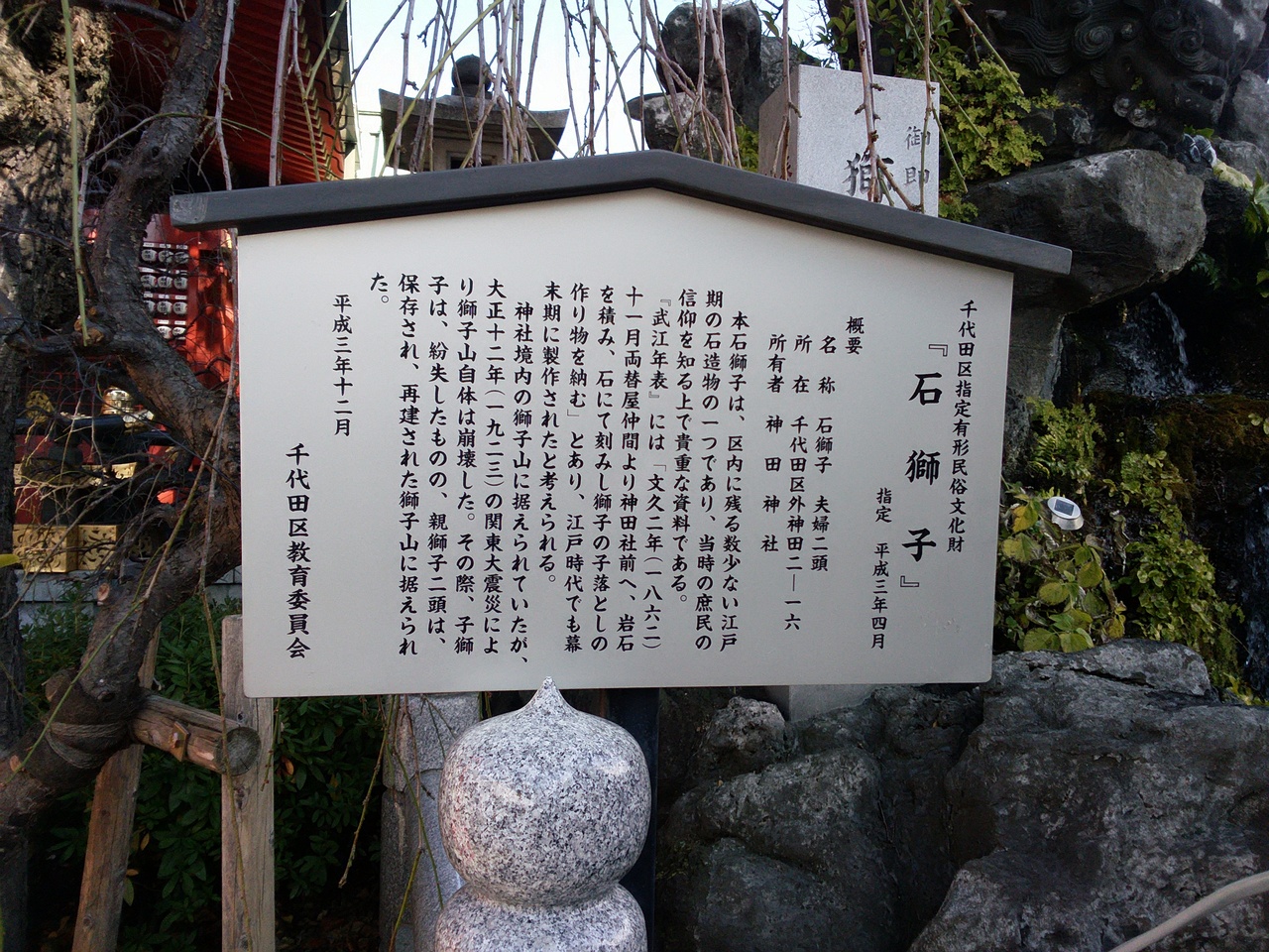 獅子山は、神田明神の御神殿(本殿)のすぐ脇にありました。獅子山に乗る石獅子は、江戸時代に造られたもので、関東大震災では倒壊したものの、その後再建されたものらしいです。現在は、千代田区指定有形民俗文化財に指定されていますが、大きな岩山の上にある石獅子は凛々しく立派なもので見応えもあるので、神田明神を参拝した際には立ち寄ってみてください。