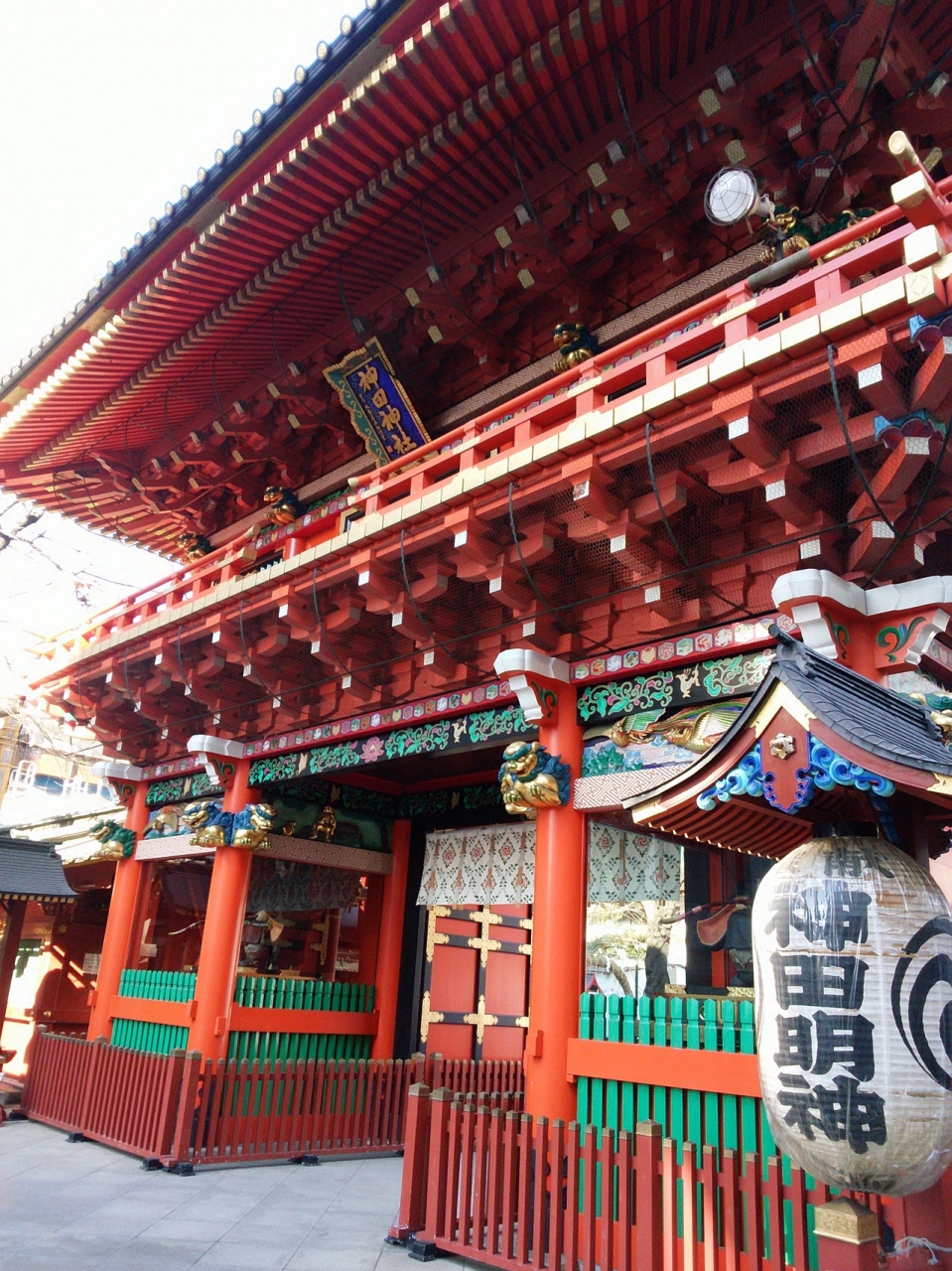 御茶ノ水駅から歩いてくると、参道の先にある門で、この門が神田明神の入口となります。朱塗りの随神門は、色鮮やかな立派な門で見応えがありました。神田明神が1300年以上の歴史を持つ神社なので、この門もかなりの歴史ある門だと思っていたら、昭和50年に昭和天皇御即位50年の記念事業として新たに再建されたものだと知り驚きました。