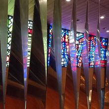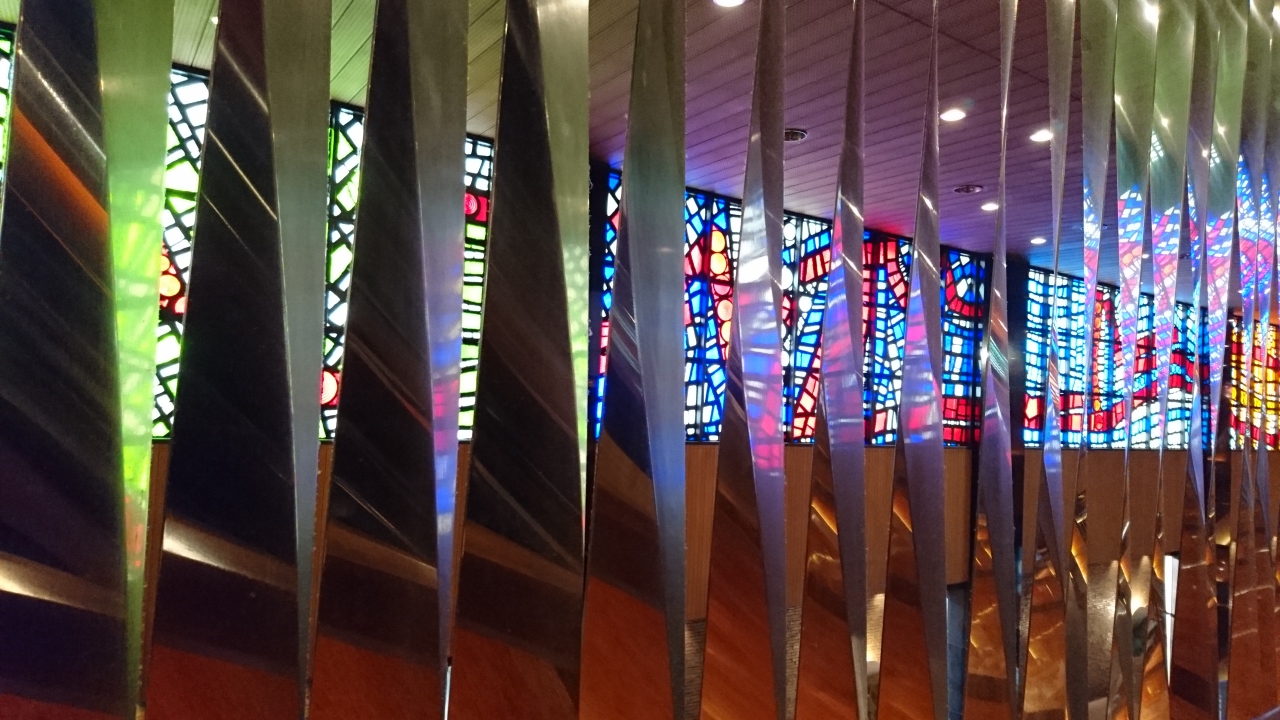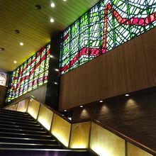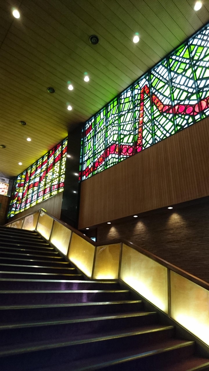 ユーミンの「朝陽の中で微笑んで}を観劇しました。幾何学模様のステンドグラスのような昭和な感じの内装がとてもよかったです。客席の足元は少し狭い感じがしましたが、クロ―クもあるし、無料ロッカーもあるので、コートや大きな荷物は預ければ問題ないと思います。