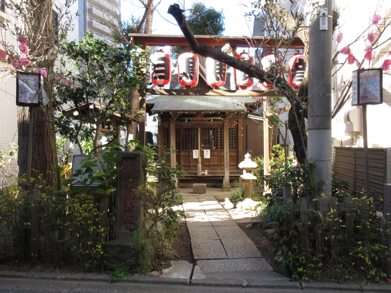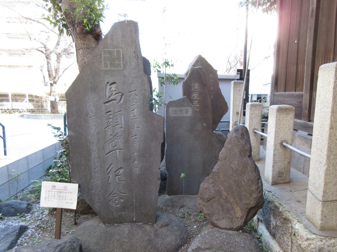 中目黒駅から3分ほど、目黒銀座沿いに建つ観音堂です。大正時代、周辺にあった乳牛牧場の牛馬の健康を祈るとともに、亡くなった牛馬の菩提を弔うために馬頭観音が安置されました。お堂の裏には勧請記念の碑も立っています。お堂に人参がたくさん供えられているのが印象的でした。現在、周辺にはビルや店が多く立ち並び、牧場があったとは想像できないほどの変わりようです。時代の流れを感じる馬頭観音です。