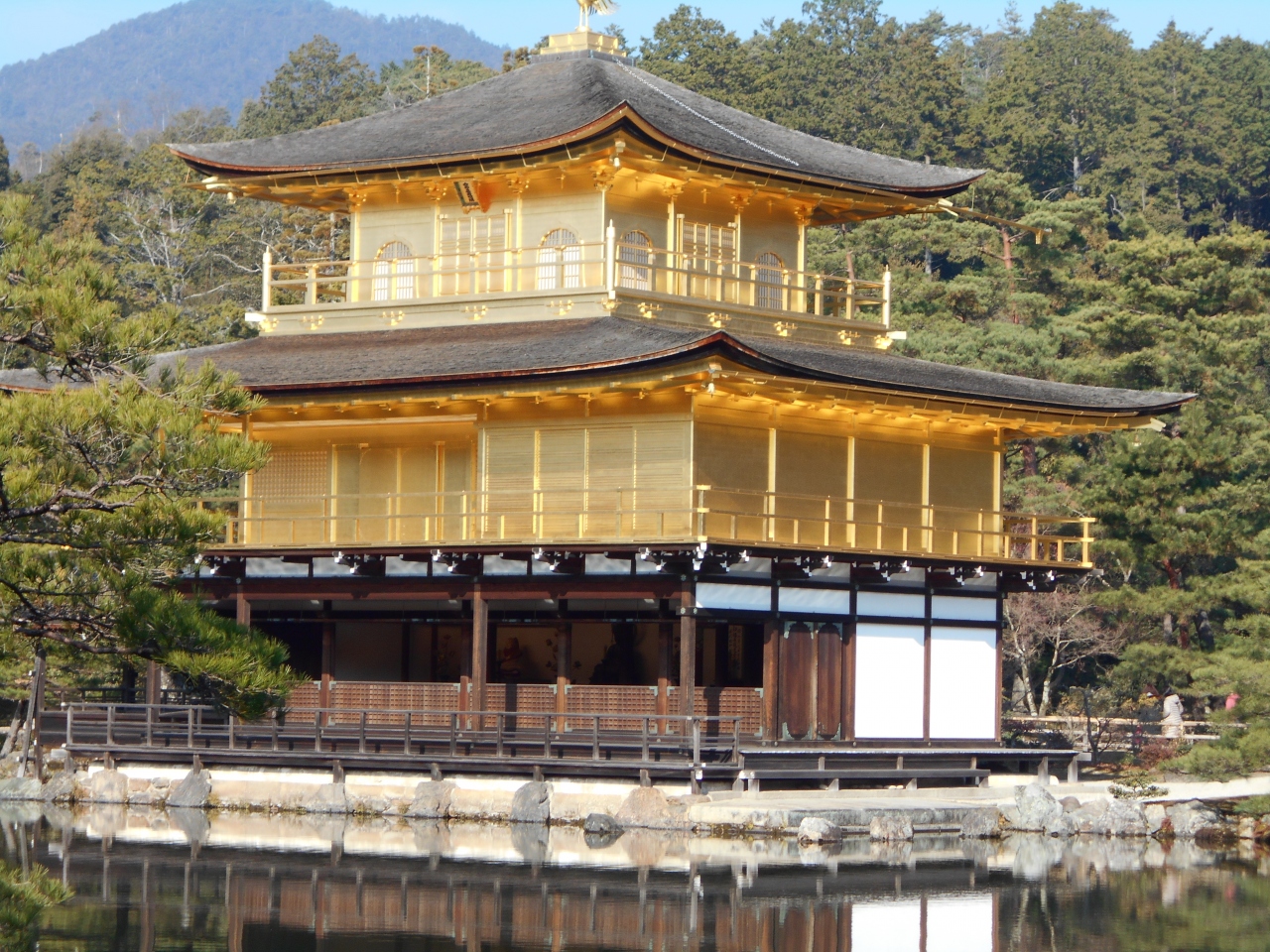 室町幕府3大将軍の足利義満が造営したもの。別名鹿苑寺です。久しぶりに訪れました。予想どうり、観光客がたくさん。お寺はぴかぴぴかで池の水にも映っていました。遠くから眺めるだけなのが残念。金閣や周りに広がる庭園は極楽浄土を表現しているそうです。