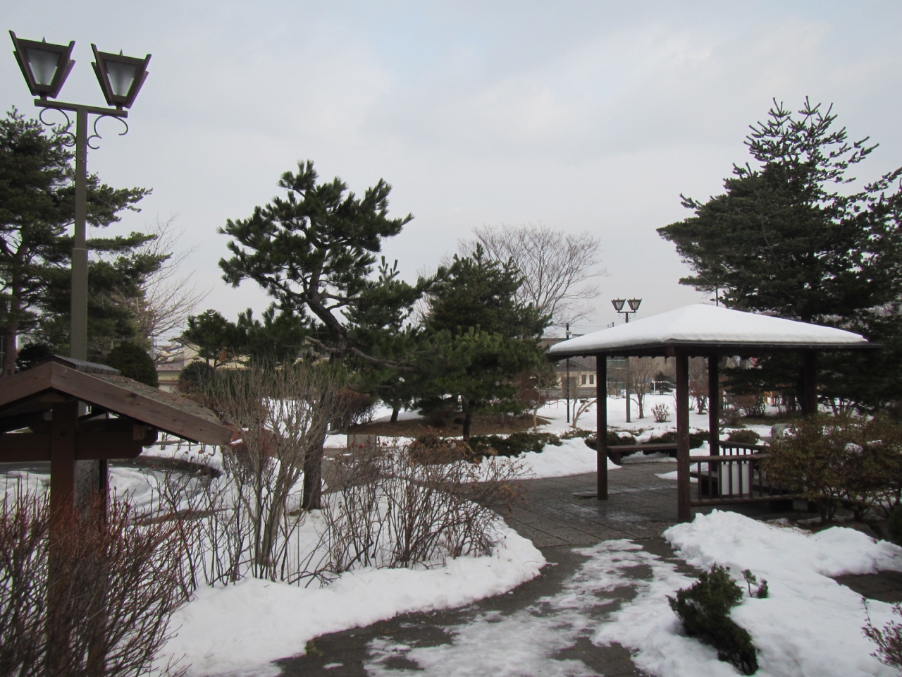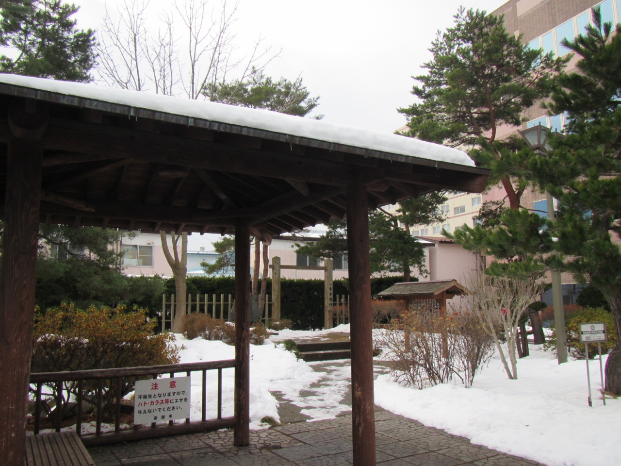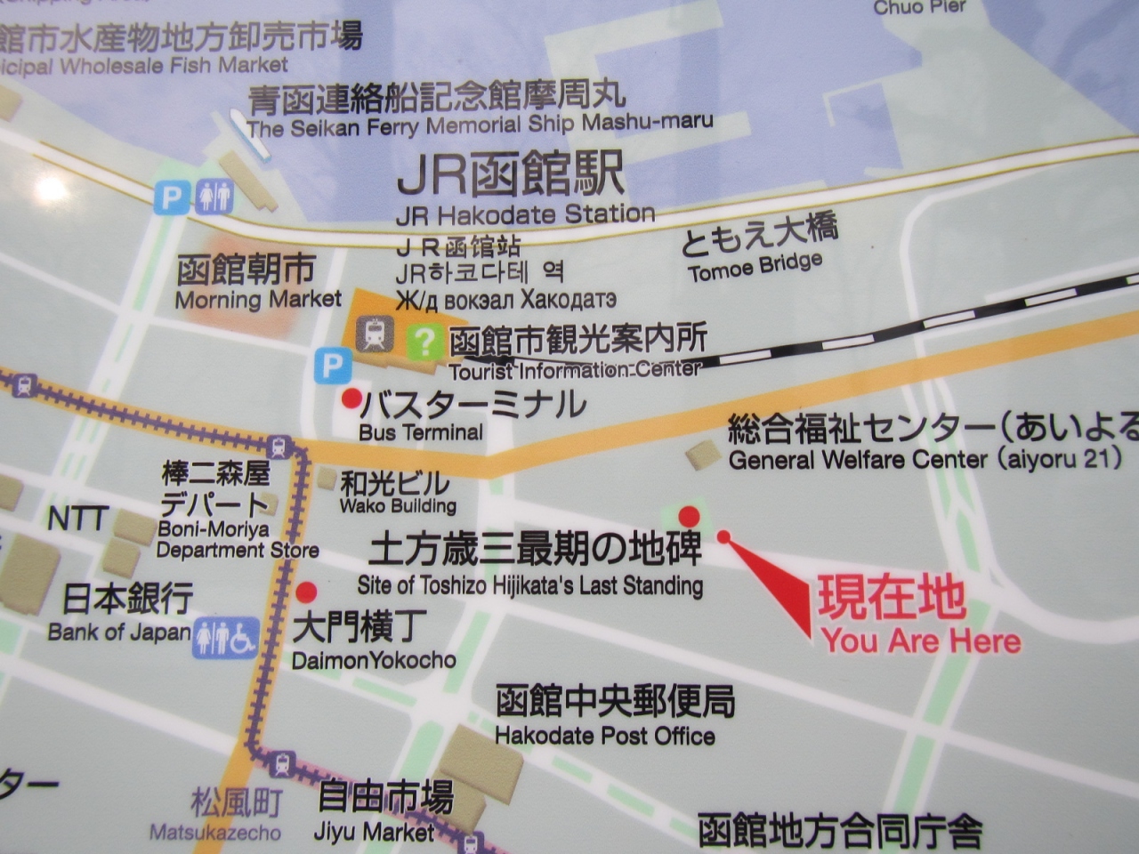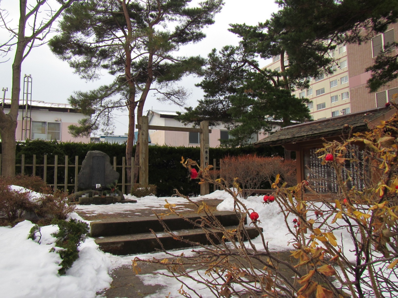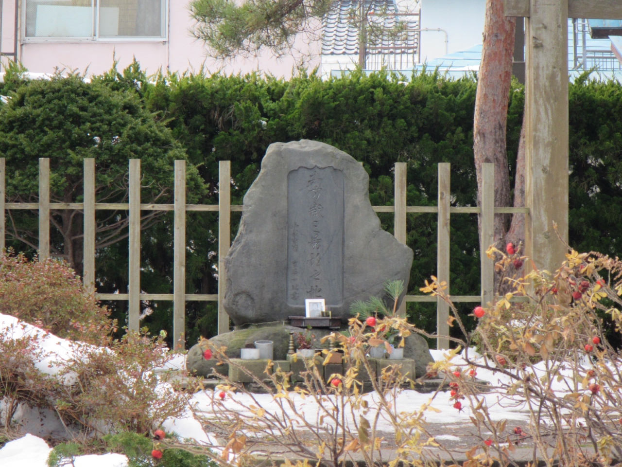 函館市総合福祉センターの前の若松緑地内にあり、前を通る八幡通り沿いには、小さな案内標識も出ています。