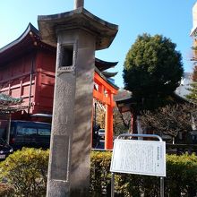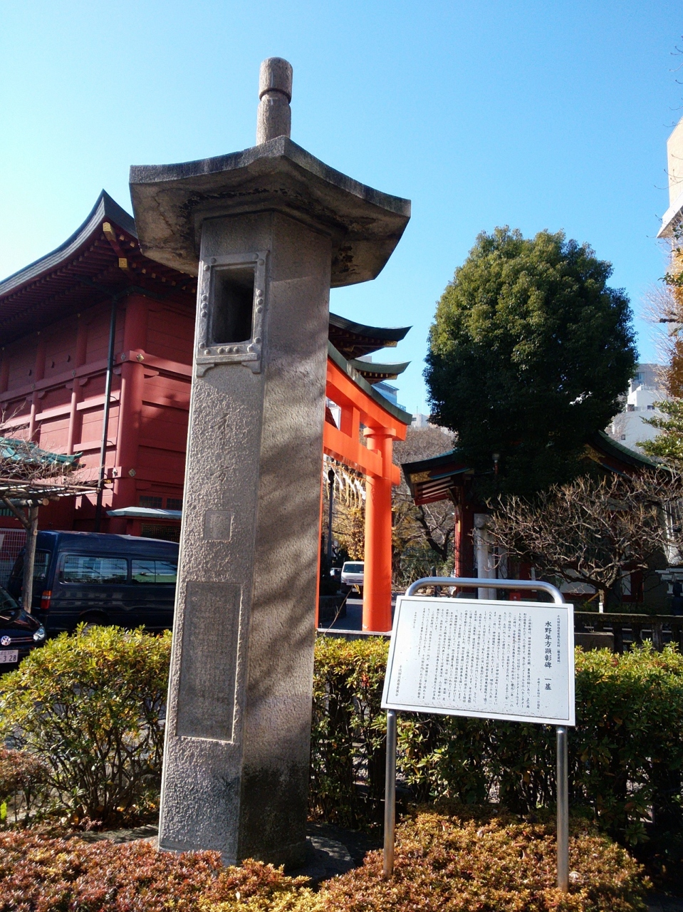 神田明神の本殿裏側(裏参道)に建っている石碑です。水野年方と言えば、江戸時代の浮世絵で美人画や風俗画を得意とした人として有名でした。この石碑は、水野年方とその一門が神田周辺と深い関わりがあったことからこの場所に建てられましたが、高さ3メートル78センチと大きいため、存在感と見応えがあります。