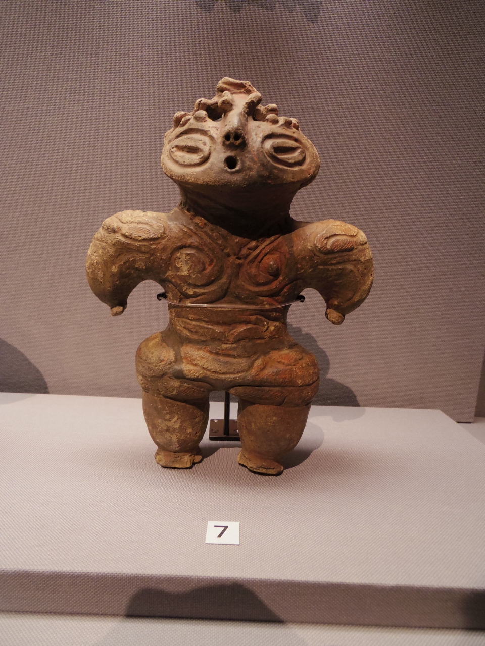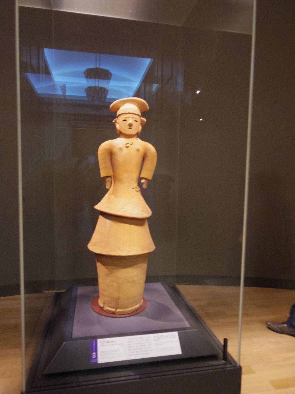 1階の考古展示室では、石器時代から近代まで日本の歴史をたどることができ、縄文時代の土偶や弥生時代の銅鐸、古墳時代の埴輪など、かつて教科書で習った覚えのある本物ばかりで感無量でした。