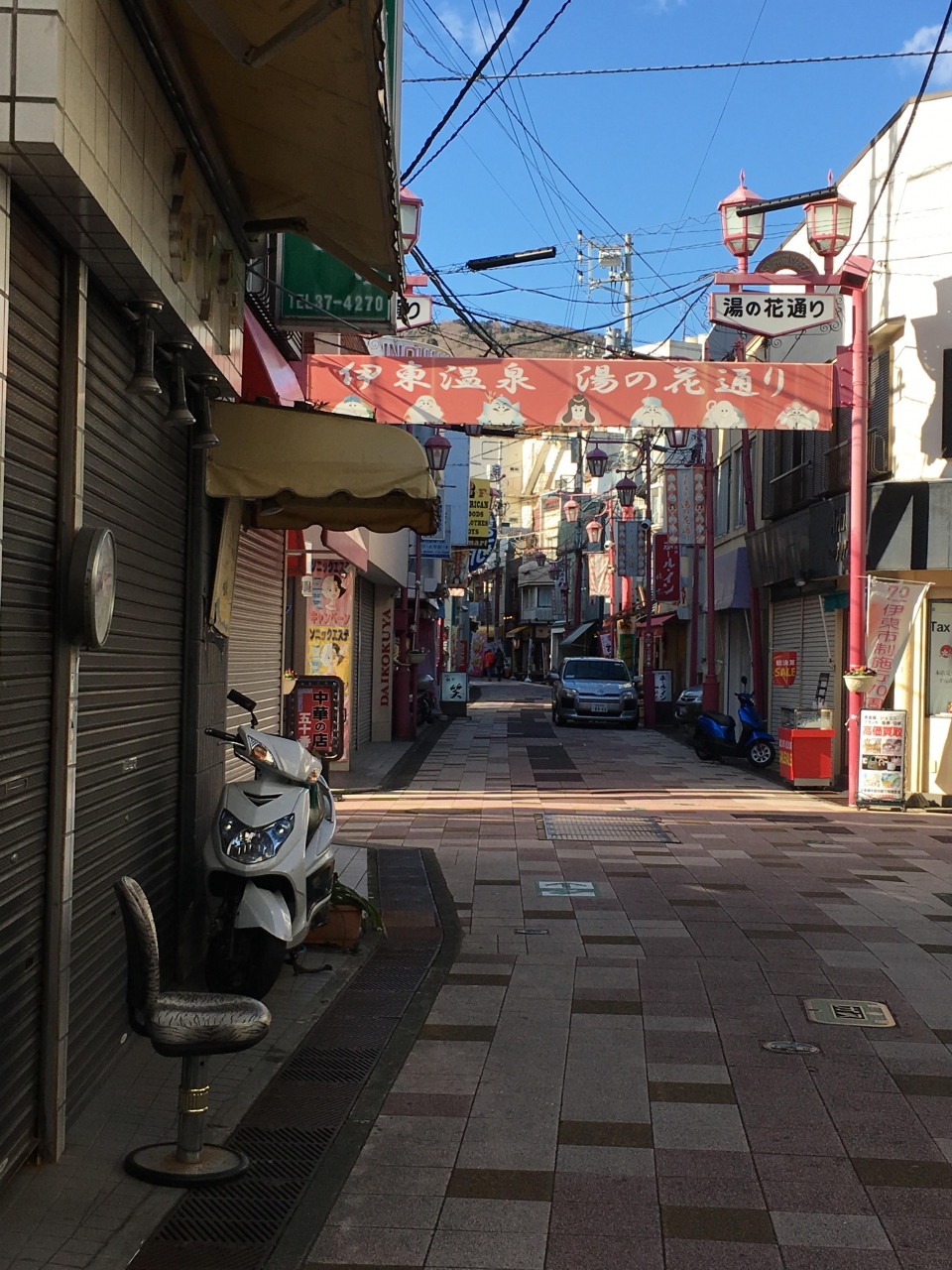 伊東駅前から湯の花通り、キネマ通りと続く昔ながらの温泉街です。湯の花通りは駅も近く人気の飲食店も並んでいて、昼間は賑わいを見せていました。宿泊施設チェックイン前後のお客さんでしょうね。夜の閉店は早そうです。