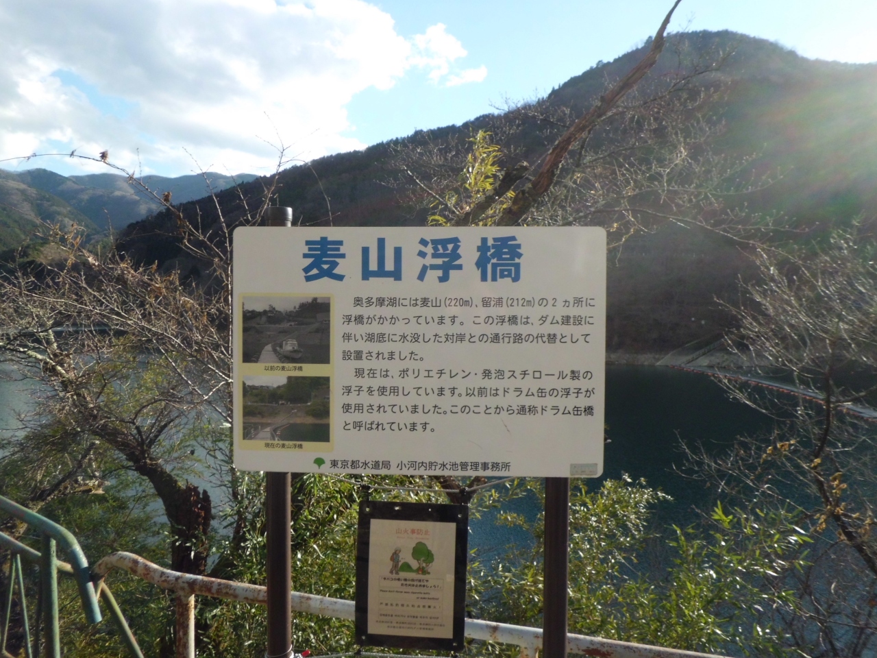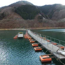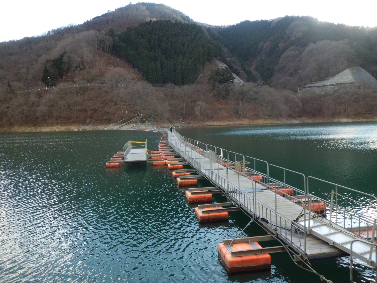 奥多摩湖を一周しましたが、途中に浮橋があります。小河内神社の入口に橋への下り口があります。車は神社の駐車場に停めましたので、ちょっと歩きました。湖上にうきを浮かべた橋は、歩くとゆらゆらと揺れて、吊り橋とは異なるスリルも味わえます。