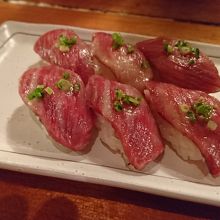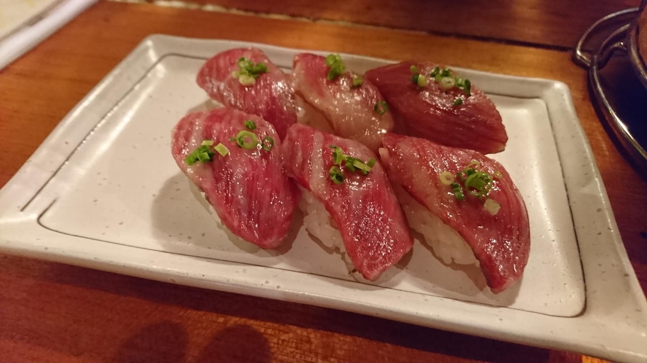 ユーグレナモール近くにあるお店。石垣島出身(東京での勤務経験があるそうです)の店主さんがやっているお店で、空いているときは話を聞くのも楽しい。ネットで「1人」「石垣牛」で検索したところヒットしたお店。カウンター席とテーブル席があり、カウンター席にもダクトがあるので、備長炭の七輪で1人焼肉も楽しめるわけです。メニューは石垣牛やアグー豚の焼肉のほか海鮮やホルモンなどメニューも豊富。今回は、石垣牛とあぐー豚のセット2980円と石垣牛のにぎり980円を注文。冷凍物で少し小さめのお肉(細切れ?)ではありますが、上ロース、上かルビ、あぐー豚のバラとロースが、結構な量入っていてお得。石垣牛の握りはお肉が少し炙ってあり、お肉の味がしっかりわかるお寿司。リーズナブルで1人でもオーケーなのは、1人旅にはなりよりもありがたい。