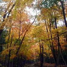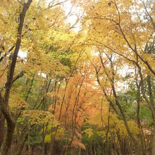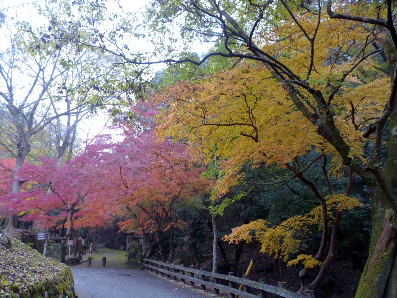 たつの神社の前を通り、紅葉谷へと入ってゆくと少し階段状になっており、その両側の紅葉は黄色が多く、周りの苔むした緑色とマッチングして、他の紅葉観賞とは少し趣が異なる。階段はずっと続きUターンするが、平日に行くとゆっくりと観賞できる。
