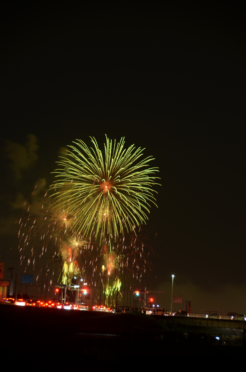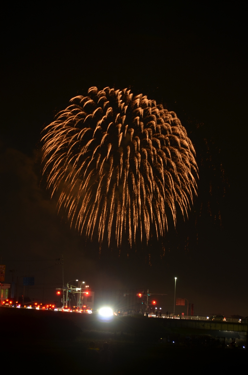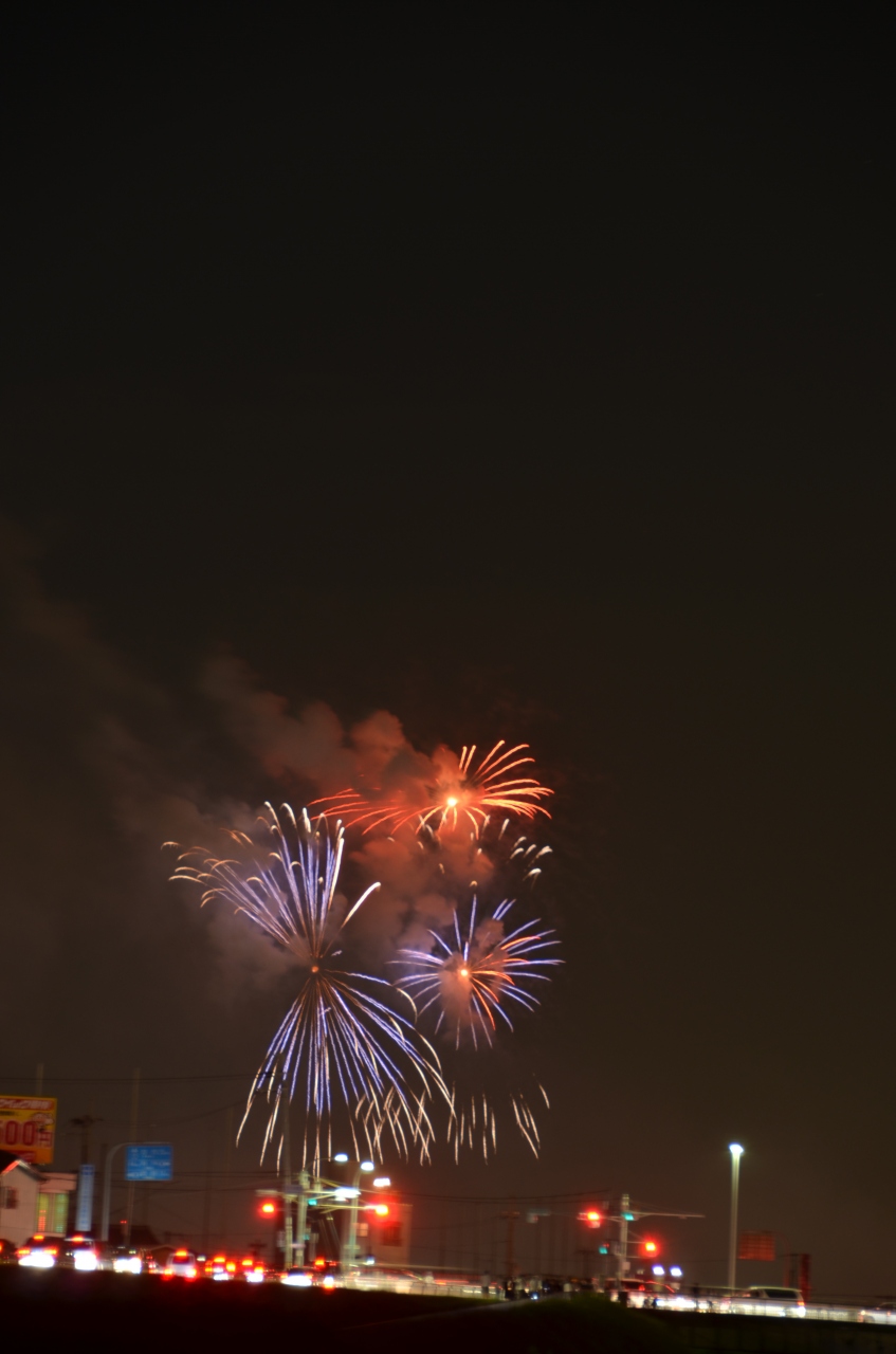 加古川の花火大会は毎年の恒例行事で、8月の最初の日曜日に開催となり、この界隈では有名です。河川敷での花火ですので自宅の近くの川原でゆっくりと観賞できます。会場近くでは夜店が多く出て賑わい狭い河川道路や2国が満員状態で渋滞しますが、川原での観賞は、人ごみも無く最高です。