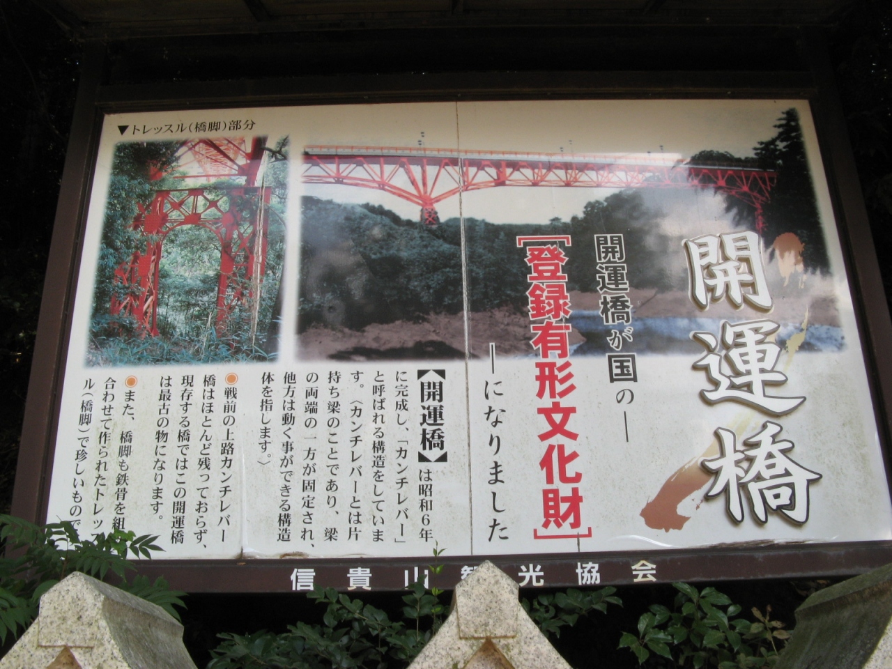 現地にあった案内板によると、昭和六年に完成した、カンチレバー(片持ち梁)構造という珍しい橋だそうで、国登録有形文化財に指定されているとか。