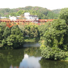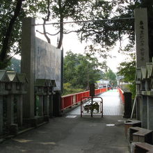 信貴山朝護孫子寺の手前、大門池の上に架かる赤い橋です。