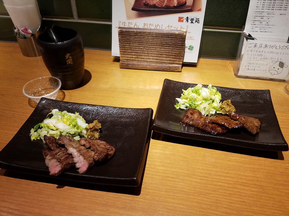 ご飯は食べたくなかったのでメニューを良く読んで単品で特上牛タン焼きと和牛焼きをそれぞれハーフサイズで注文。飲み物は他に惹かれるものもなかったので冷酒にしました。