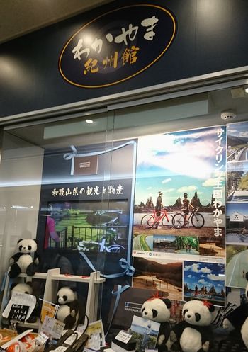入口にディスプレイされたパンダのぬいぐるみ、最近パンダで話題になった「アドベンチャーワールド」が和歌山でした。