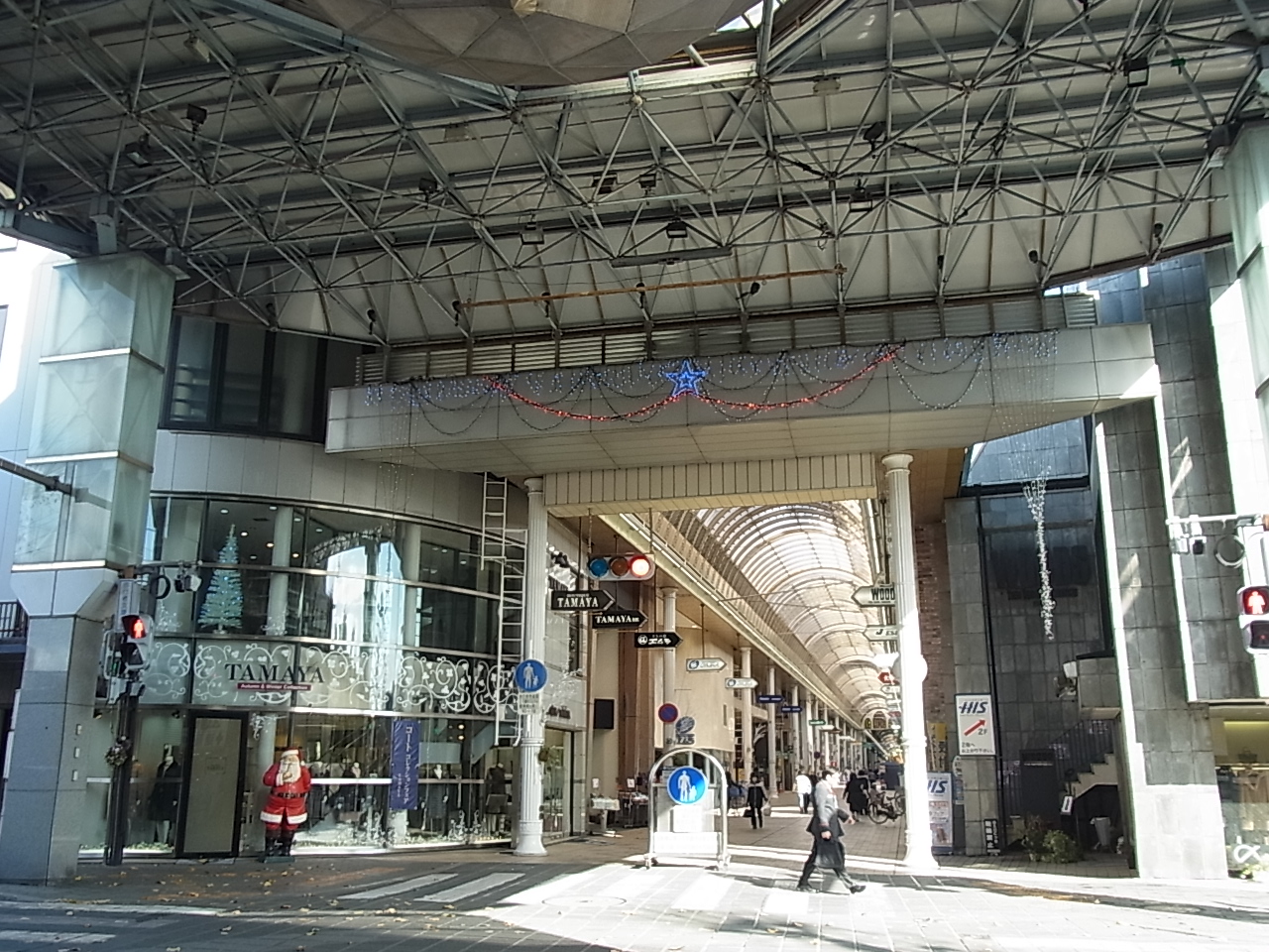 JR山口線の山口駅から市役所方面へ通りを真っすぐに徒歩5分、商店街と交差します。12月ということもあり年末の福引大会なども模様されており活気のある商店街です。また、かなりの割合でアーケードが設置されているので、観光帰りに雨に降られましたが移動の時には助かりました。是非、覗いてみてください。