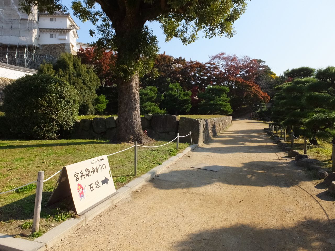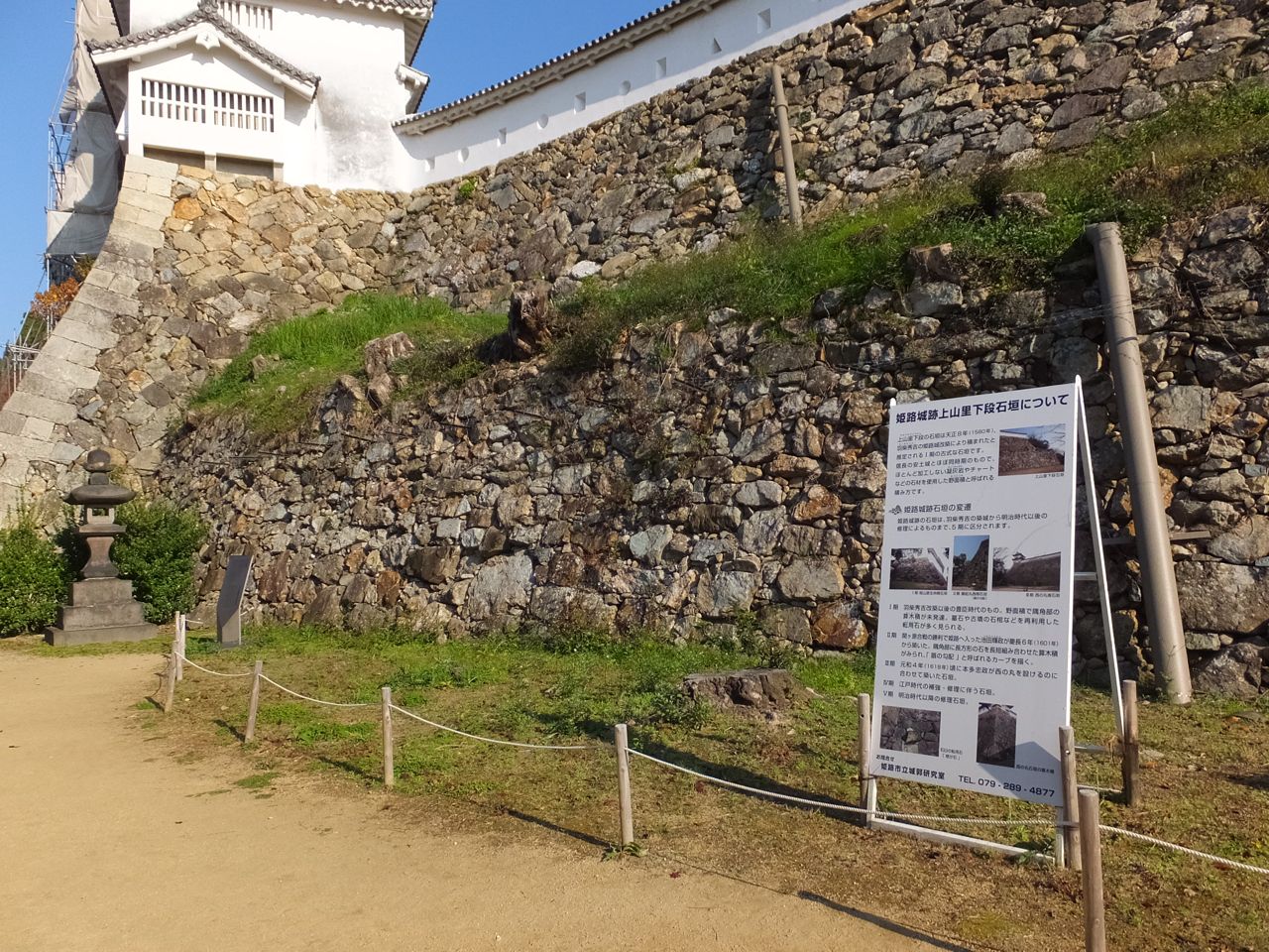 姫路城の料金所の手前に「官兵衛ゆかりの石垣」の表示があったので左折。無料エリアなので見落とすことが多いと思います。立派な櫓の横の下の方は2段になって段差がついています。横に案内板があって、この部分が羽柴秀吉の時代の姫路城の石垣とのこと。向こう側の櫓の下のきれいな石垣と全く違います。戦国時代のほんのちょっとの間に石垣の積み方も大きく変わり、江戸時代になると優美に強健になっていく感じが直接比較できてためになりました。