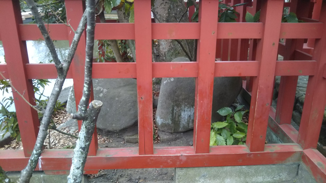 鶴岡八幡宮の中の源氏池の近くに旗上弁財天社がありますが、その神社の裏手にこの石はあります。特に説明や案内板があるわけではないので、見逃してしまいそうになりました。柵に覆われており、残念ながら触れることはできません。見た目には普通の石ですね。せめて案内板とかがあるといいのですが。
