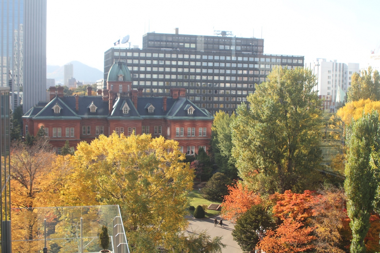 上層階には展望スペースもあって、紅葉&黄葉に彩られた「赤れんが庁舎」を正面方向から見下ろすことができました。