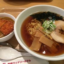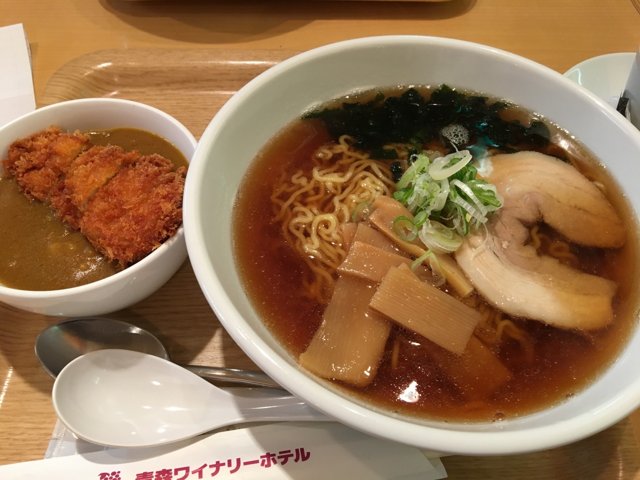 青森空港の施設内にあるレストランです。こちらでランチを摂りました。ラーメンとミニチキンカツカレーのセットをいただきます。