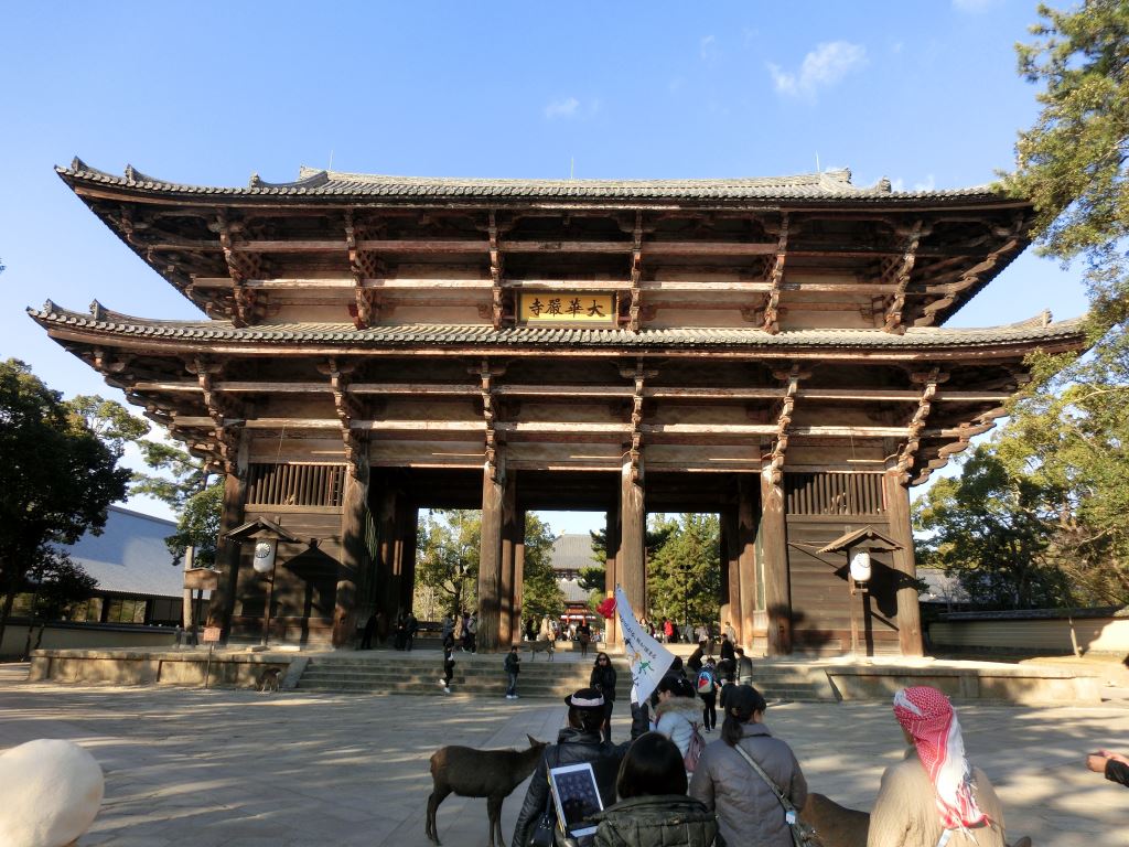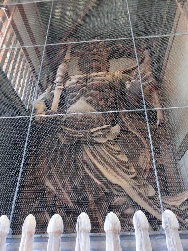 広大な東大寺、鹿の遊ぶ参道を進むと大きな南大門があります。高さ25m余りの国内最大級の山門で二層になっていますが門内から見上げると下層の屋根がなく吹き抜けになっています。門内左右に運慶・快慶作の巨大な金剛力士像がド迫力の形相とお姿で寺を守っています。向かって右が吽形、左が阿形の高さ8.4mの木像はまさに見上げる程の巨大さです。入口である南大門と仁王像を見るだけでも東大寺の壮大さが想像できます。