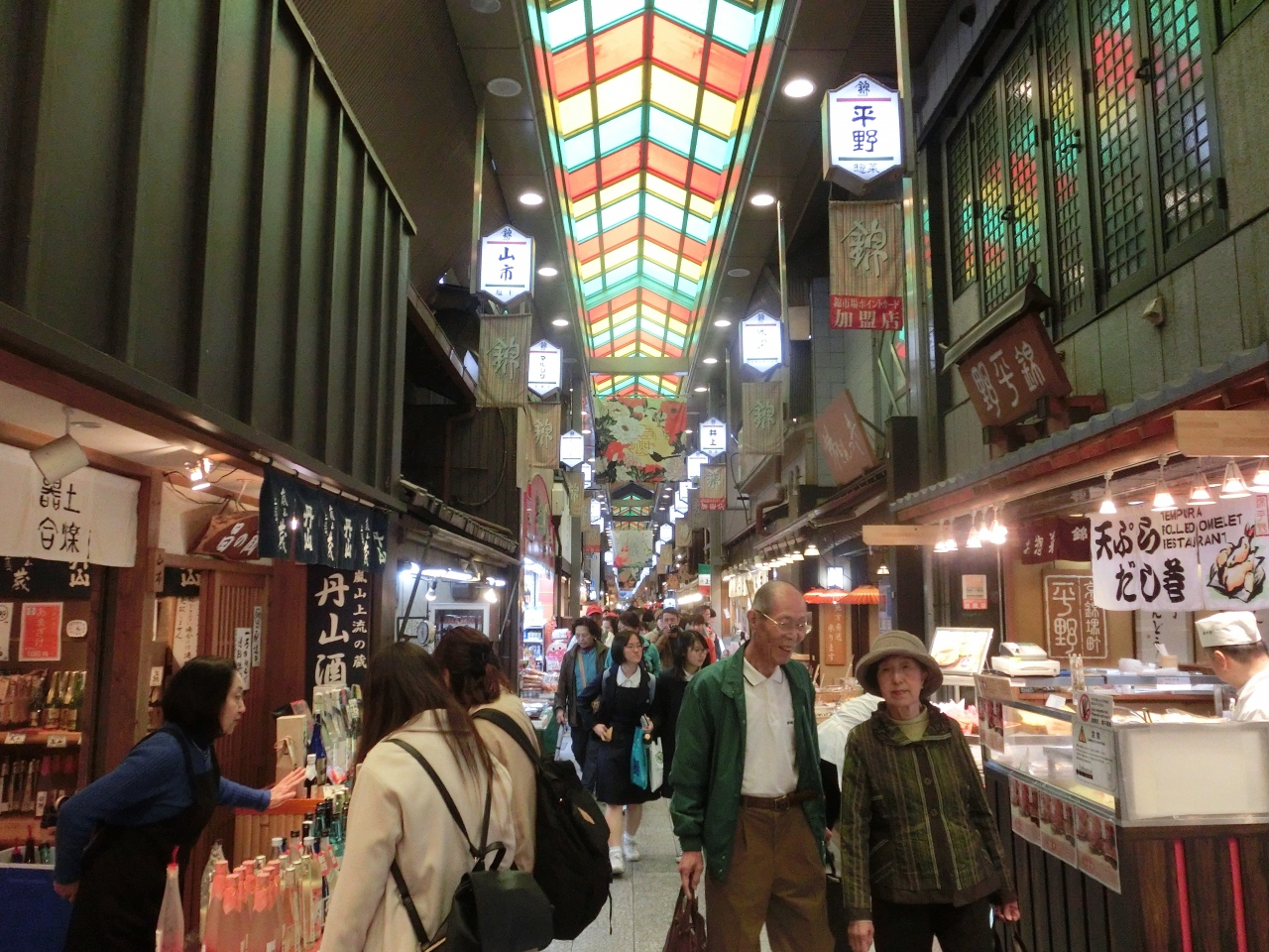 河原町近くの西京極から烏丸までの長い路地の両側に続く錦市場は京都の地元民のお台所と言われてのきましたが、今や外人観光客が大挙して押し寄せる縁日のようです。時代の趨勢とはいえ、さびしい気もしますが、活気があるのは悪いことではないかも。