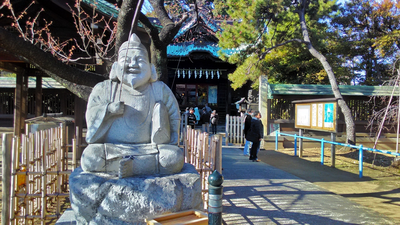 2009年から毎年お正月に七福神巡りをしていますが今年は6日土曜日に東海七福神に参りました。恵比須様の荏原神社は旧東海道沿いにあり最寄り駅は京急「新馬場」、七福神巡りですと寿老人の一心寺から徒歩5分です。私は逆から参りましたので品川寺(毘沙門天)から徒歩15分程です。目黒川にかかる赤い橋(神橋)を渡り境内に入るとすぐ恵比須様の石像があります。ふくよかなお顔とお姿に心が和みます。709年創建の由緒ある神社で恵比須様の先に続く龍神を祀る社殿には風格を感じました。