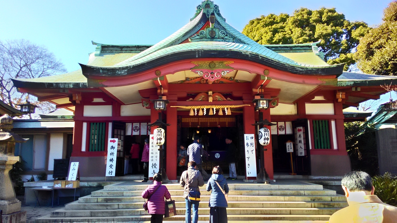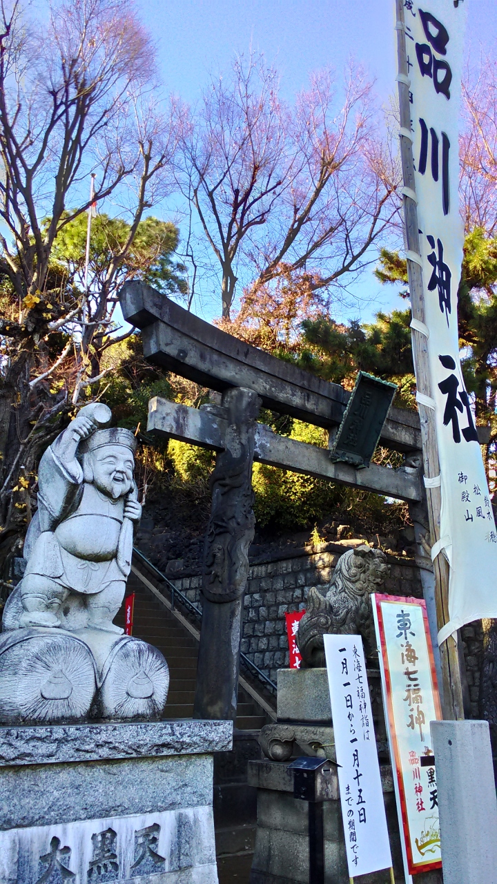 2009年から毎年お正月に七福神巡りをしていますが今年は6日土曜日に東海七福神に参りました。最寄り駅は京急の新馬場でほぼ駅前に神社があります。第一京浜沿いに鳥居と大きな白いのぼり旗がありその横で大黒天の石像が参拝客を出迎えます。大黒天はふくよかなお顔とお姿でした。急な石段を上ると広い境内となり正面に壮麗な社殿があります。神楽殿もあります。神社は1187年の創建、源頼朝の勧請とあり歴史と由緒を感じます。今年の七福神参りの御朱印は最初の磐井神社が書置きであった為、御朱印帳ではなく、色紙に御朱印スタンプを頂きましたが、各寺社で御朱印の為に並ぶこともなく色紙もよいものだと思いました。東海七福神めぐりの期間は1月15日までです。