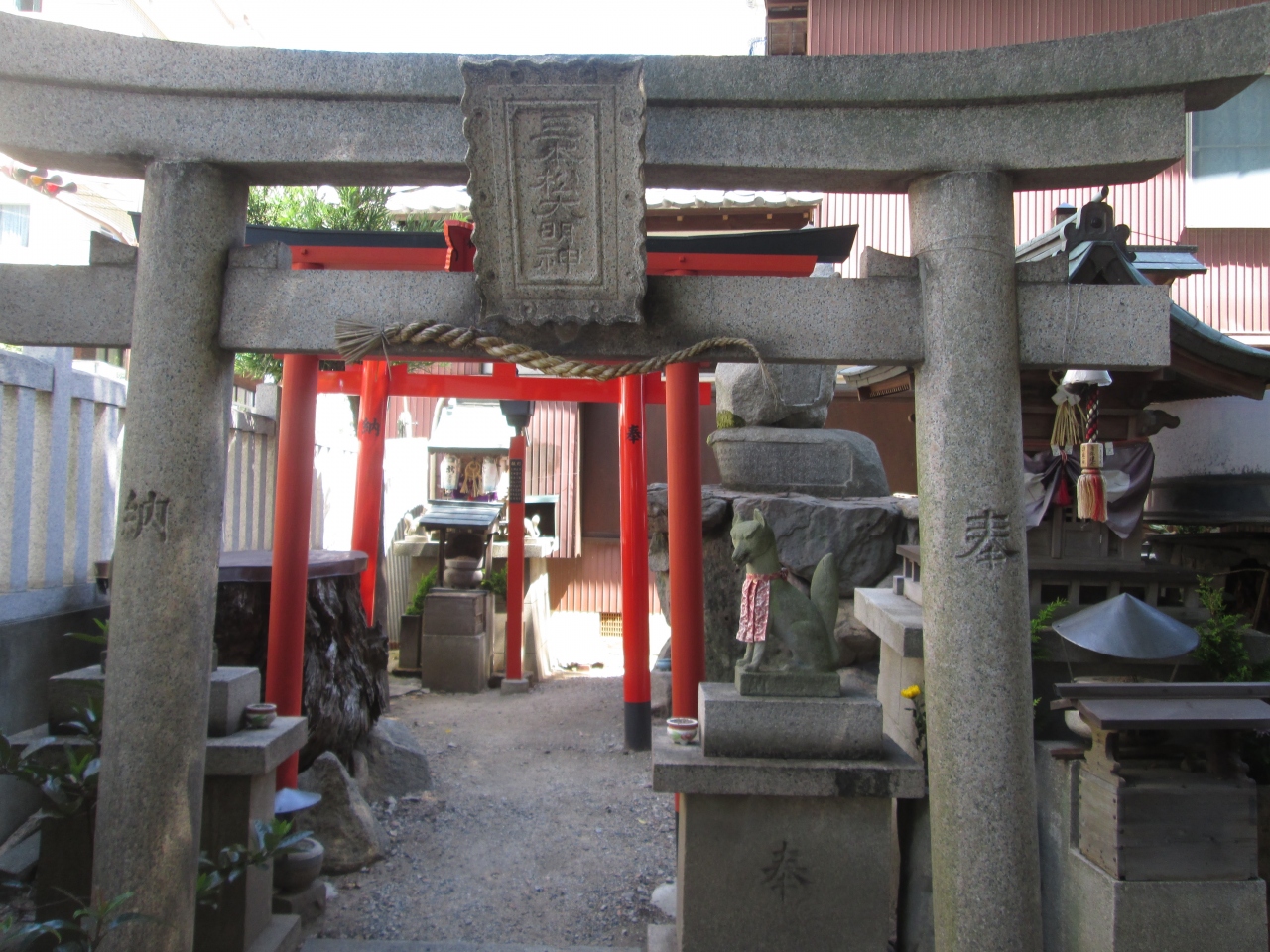 三本松不動院の境内は非常に狭く、入ってもいいのかと思うぐらいでしたが、結果的に自由に見学できました。境内のほぼ中央に鳥居があり、その奥には赤い鳥居が見えました。こちらをにらんでいるような目つきの狐がいて、西洋の町並のなかに日本らしい社でした。