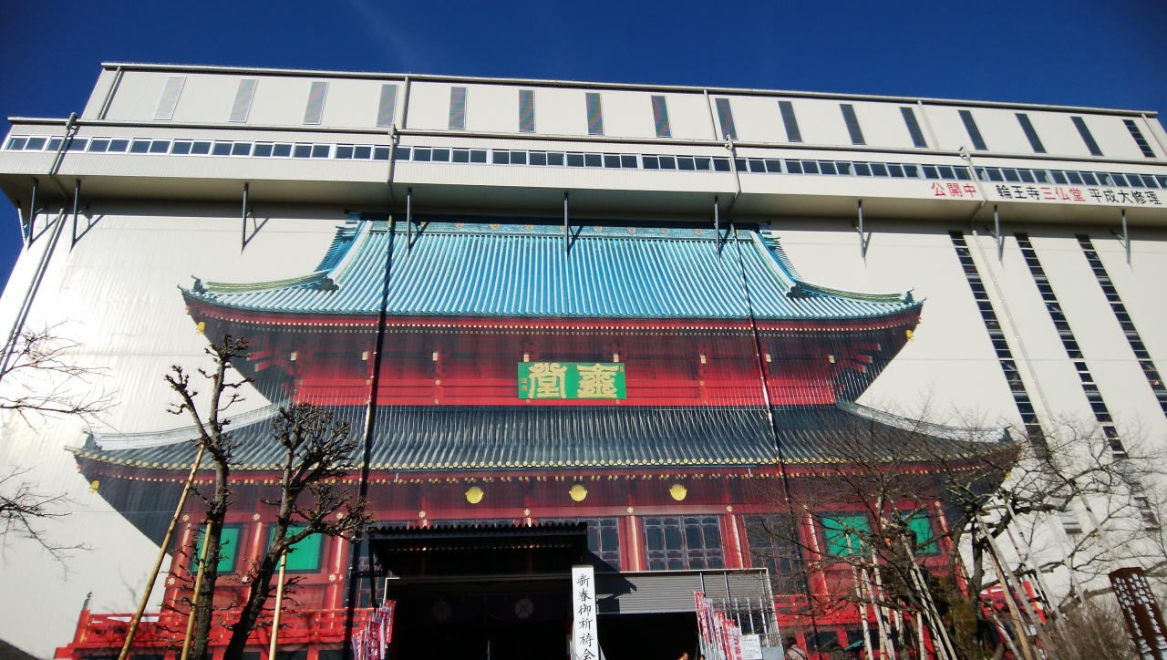 こちらは外観がカバーされていて、壁紙みたいに絵が描かれたポスターで外観の様子がわかるようになっています。中には3つの仏さまがおられます。ちなみに中は有料。説明があるので、それはよかったが、結構お守りの説明というかセールストークがあります。
