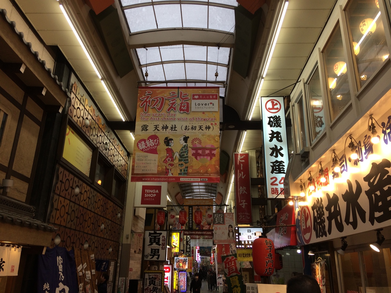 梅田エリアの真ん中にある商店街で、昼も「お初天神」に向かう参拝者やサラリーマン、近所のおばさんなどが闊歩、夜は夜で繁華街を練り歩くサラリーマンやOLがたくさんいます。ラーメン店や居酒屋、カラオケ店などの飲食店や、ドラッグストア、コンビニエンスストアが軒を連ねています。北新地と比べて庶民的な雰囲気に感じました。