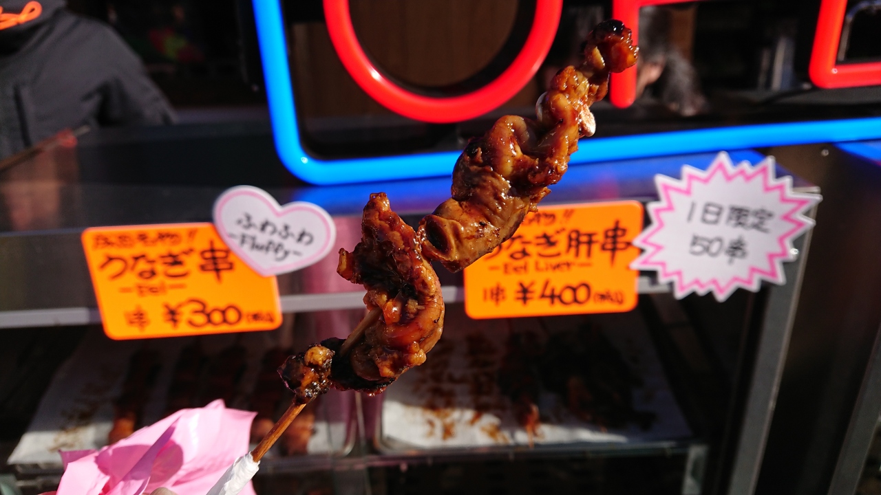 初詣客で参道が混雑しており、各店で店頭販売をしていたのですが、ここシェアーズキッチンの店頭販売のおいしそうな串を発見!