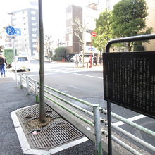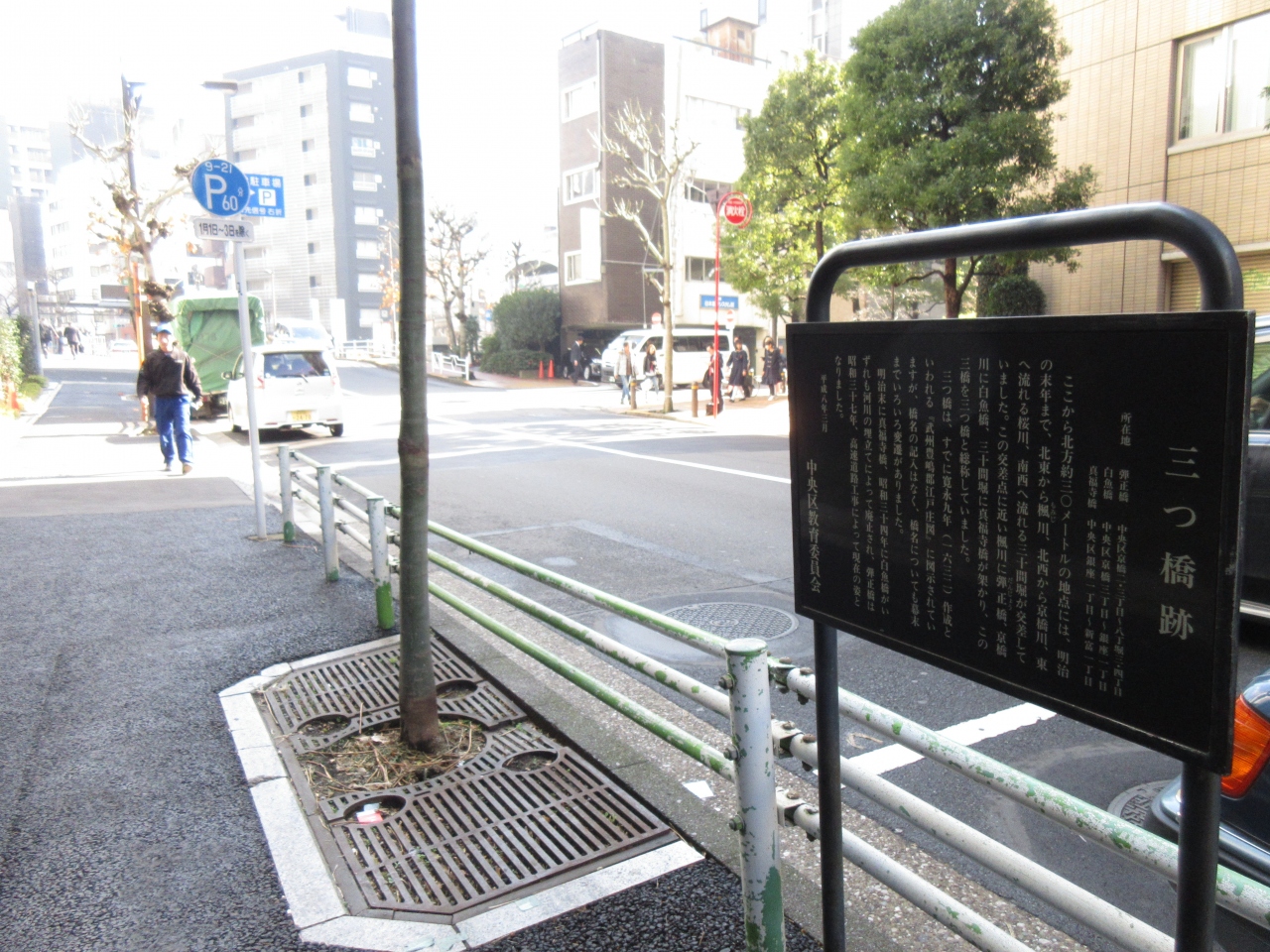 道路を挟んで、京橋プラザの向かいの歩道に説明板が立っています。明治時代に楓川、京橋川、桜川、三十間堀が交差し、それぞれの川に弾正橋、白魚橋、真福寺橋の三つの橋が架かっていたそうです。残念ながら現在は川が埋め立てられてしまい、橋は無くなり、近くを高速道路が走っています。当時は風情ある景観が楽しめたと思われるだけに、当時の姿を見てみたい気がしました。京橋プラザに隣接した京橋公園には蜊河岸の説明板が立ち、そこにも三つ橋について書かれています。あわせて読むとよりわかりやすいかと思います。
