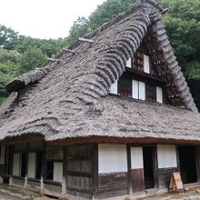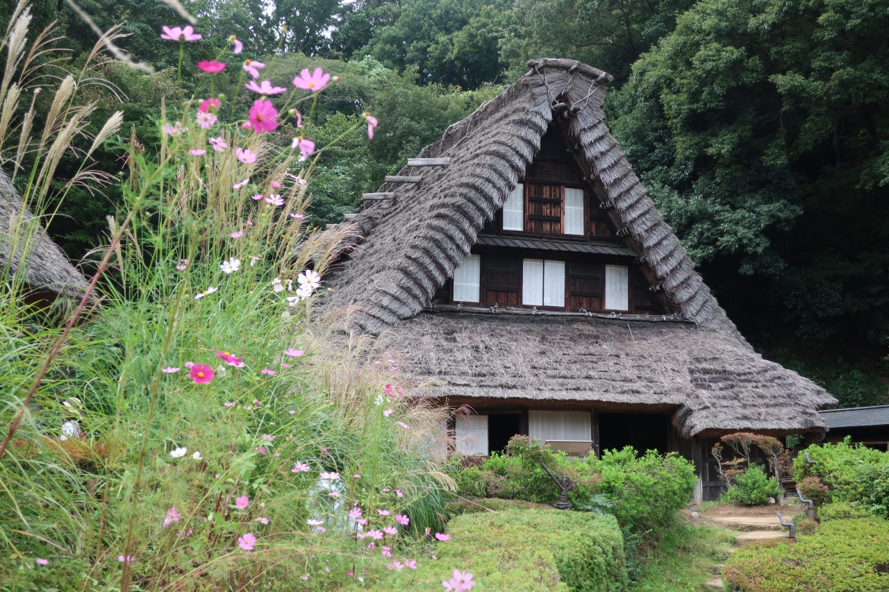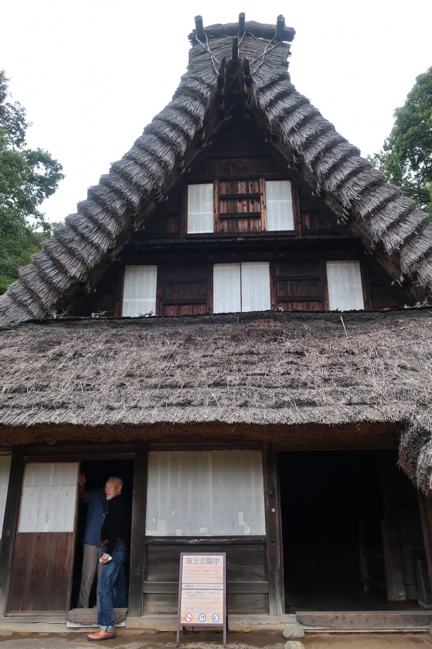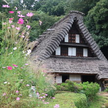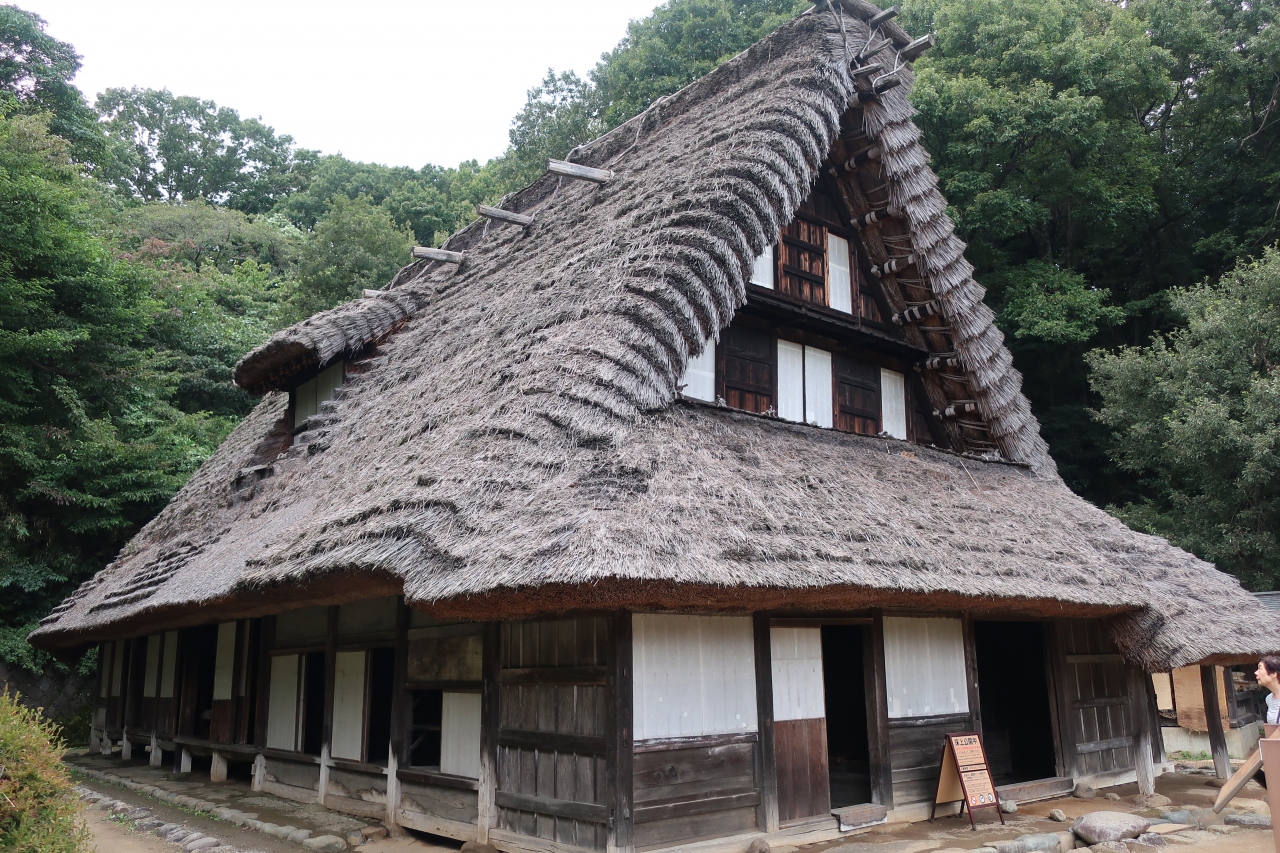 川崎市立古民家園にある合掌造りの古民家です。富山の五箇山のあった江戸中期の建物で、急勾配の合掌している様な形の茅葺屋根が特徴的です。中に入ると馬やのある広い土間があり、その奥に板間の居住空間があります。