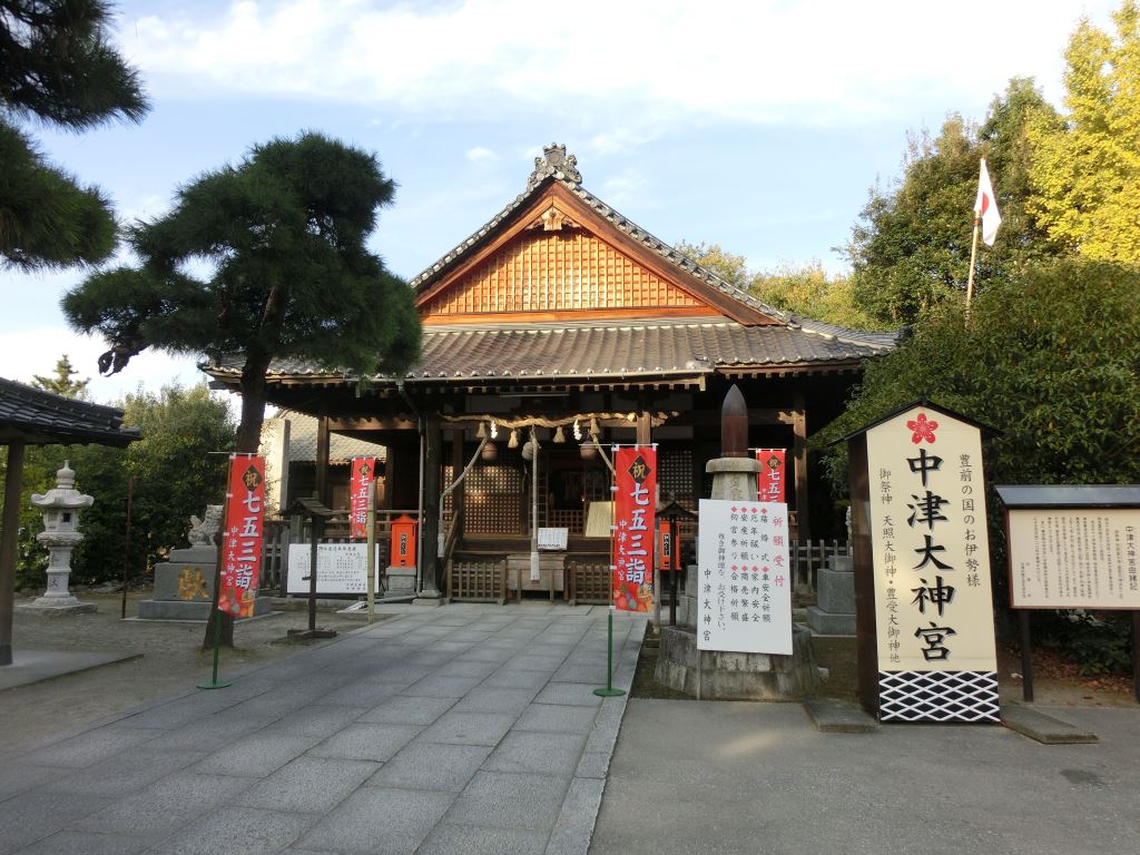 中津城見学の際に中津城址内にある中津大神宮に参拝しました。JR中津駅から徒歩でお城を目指すと中津神社の鳥居をくぐり城址に入ることになります。そのまま進むと中津大神宮があります。伊勢神宮の大神様の分霊をお祀りし地元では豊前の国のお伊勢様として親しまれているようです。城址には多くの神社がありますが七五三詣の幟がはためいていたせいもあるのか他の神社にはない華やぎを感じました。中津神社は別にあるようですが見逃しました。