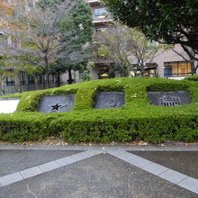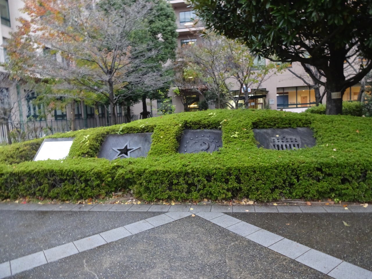 聖路加看護大学前の広場、植え込みの中にかつての公使館跡を示すプレートや星形の石碑などが残され、展示されています。