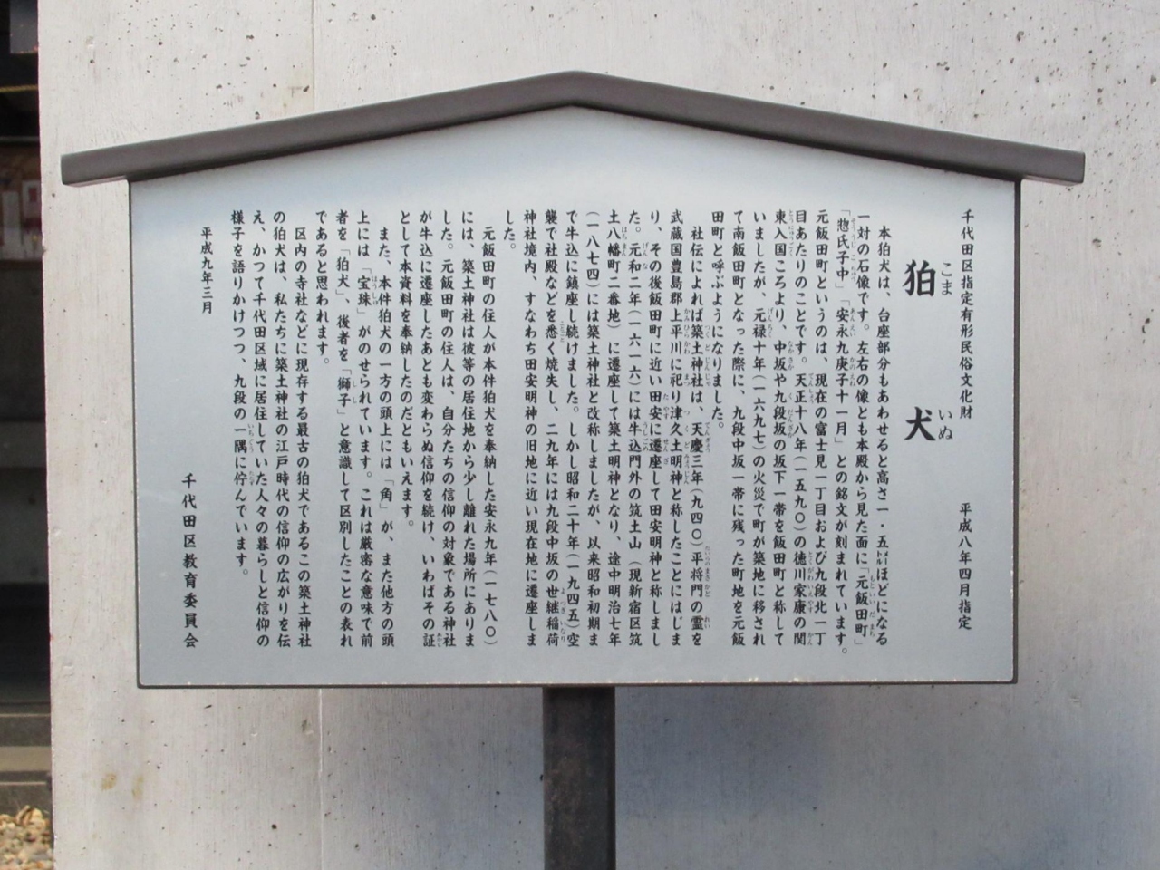 また、社殿前にある狛犬は、安永9年 (1780) 元飯田町の住人が奉納し、千代田区内の寺社などに現存する最古の狛犬で区の有形民俗文化財に指定されています。