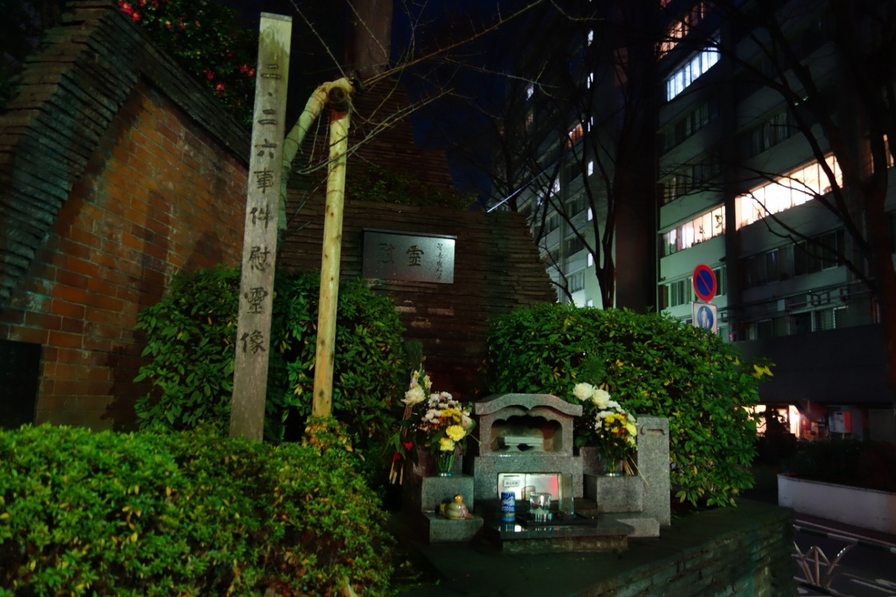 NHK前の道を歩いて通っていた時にNHKから道路を挟んで向かい側、渋谷の合同庁舎敷地に向かって右の角に慰霊碑が有るのを見つけました。二二六事件の慰霊碑だそうで、新しいお花が供えられていたのを見て関係者などしばしば訪れているのだろうなぁと想像しました。