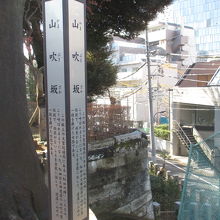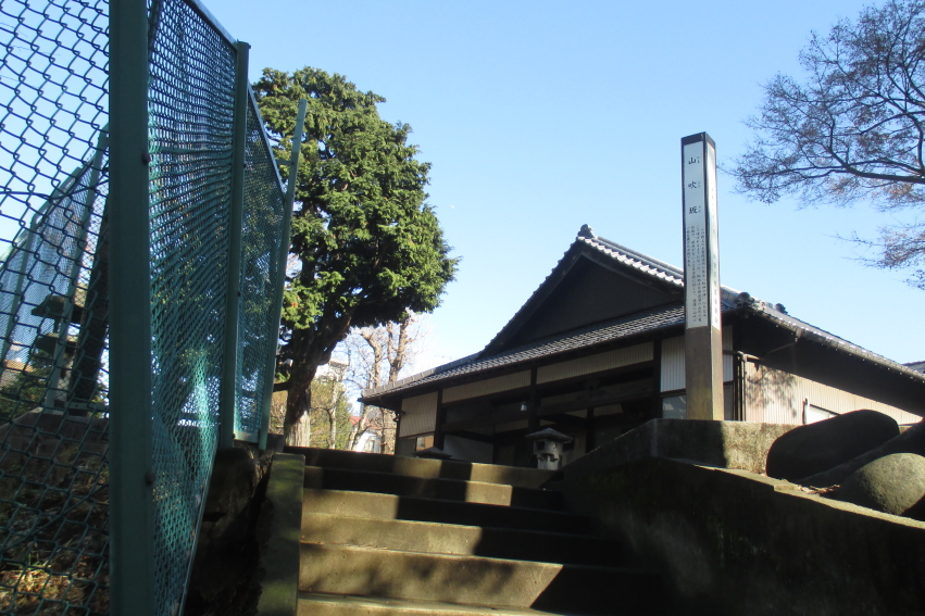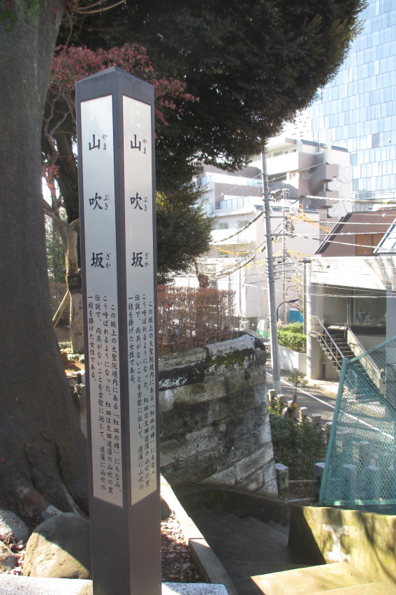 西向天神社(大聖堂)の正面鳥居の少し左に狭い階段があります。これが山吹坂のなれの果てということの様です。太田道灌の山吹の里伝説の紅皿の墓と伝えられる板碑が、境内にあることからこの名前が付けられたそうです。現在の様に土地改造される前の往時にはどんな坂道だったのでしょうか。