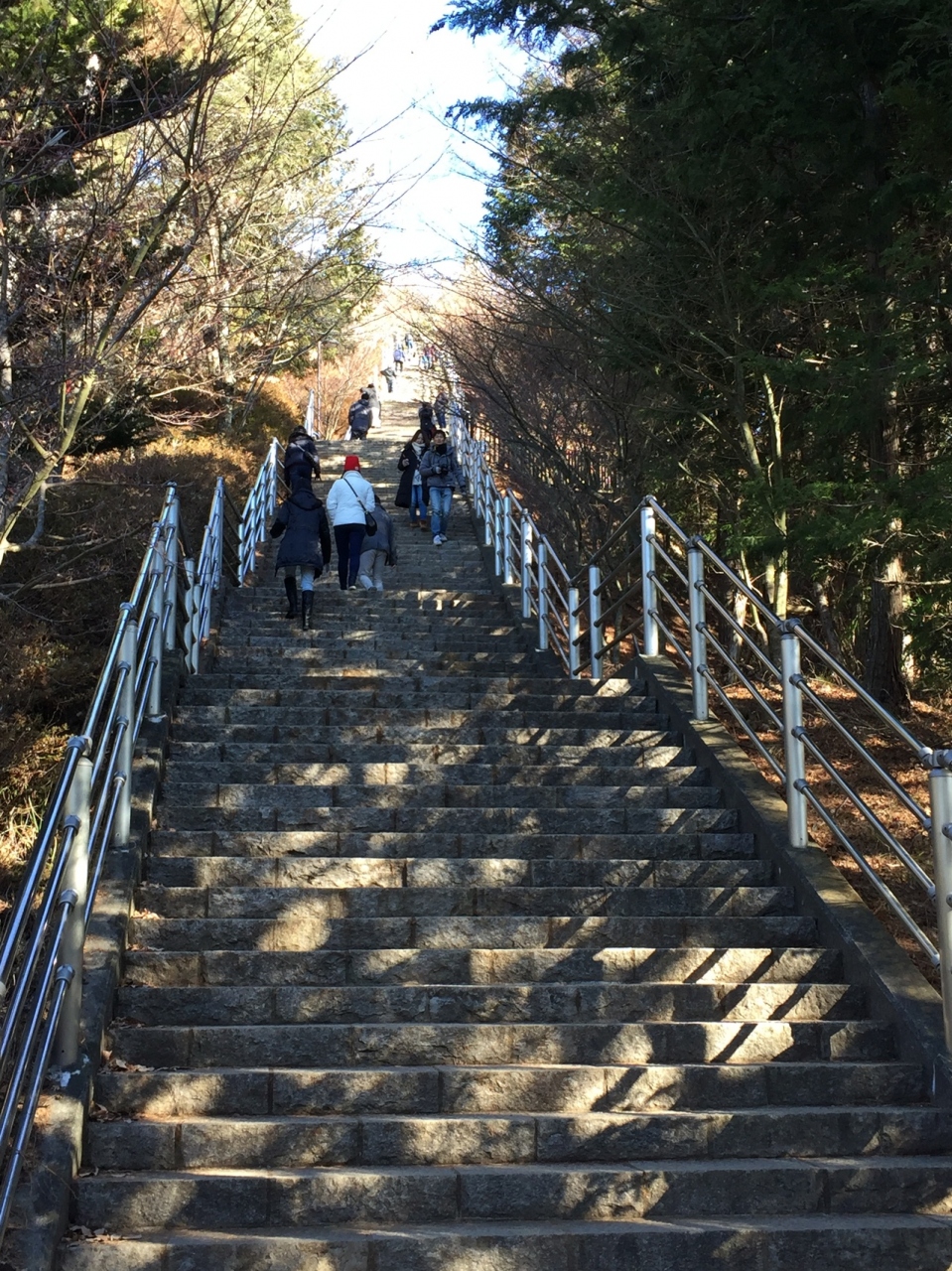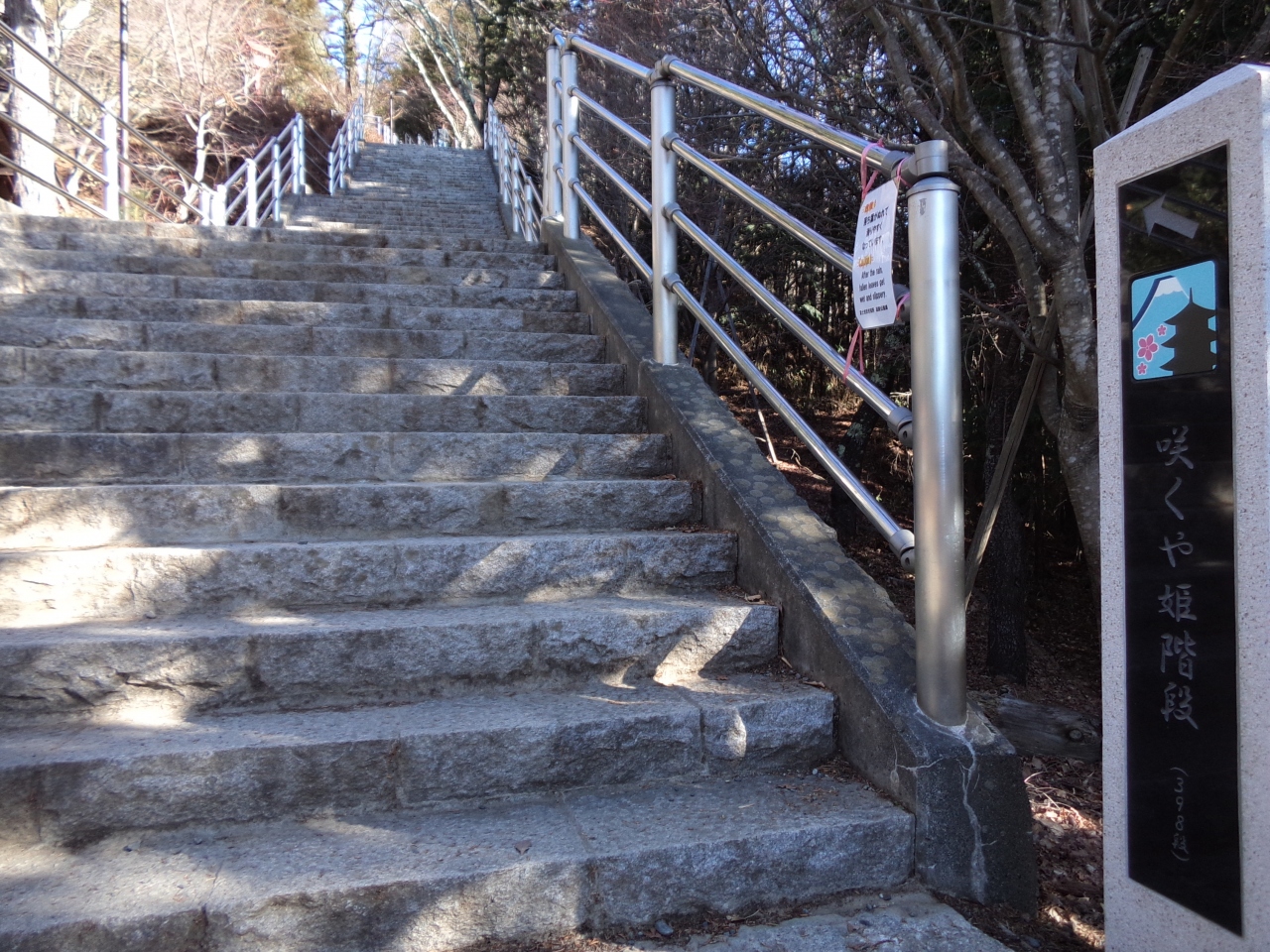 外国人観光客が増えた事で色々と整備されたのか、JR下吉田駅からはキレイに舗装された歩道を案内に沿って歩いて行けば良いだけなので迷う事はありません。 新倉山浅間公園(神社)の入口までは徒歩10分かかるかかからないかです。 そこからこの景色を見れる場所までは400段の階段を上る必要があります。 一応階段の横に車道(急な坂道)もあるのですが私が行った年末は凍結の恐れありということで、公園内の車道自体が閉鎖されていました。 車で行く場合には、入り口近くに駐車場があるので安心です(階段400段はどちらにしても歩きます)。