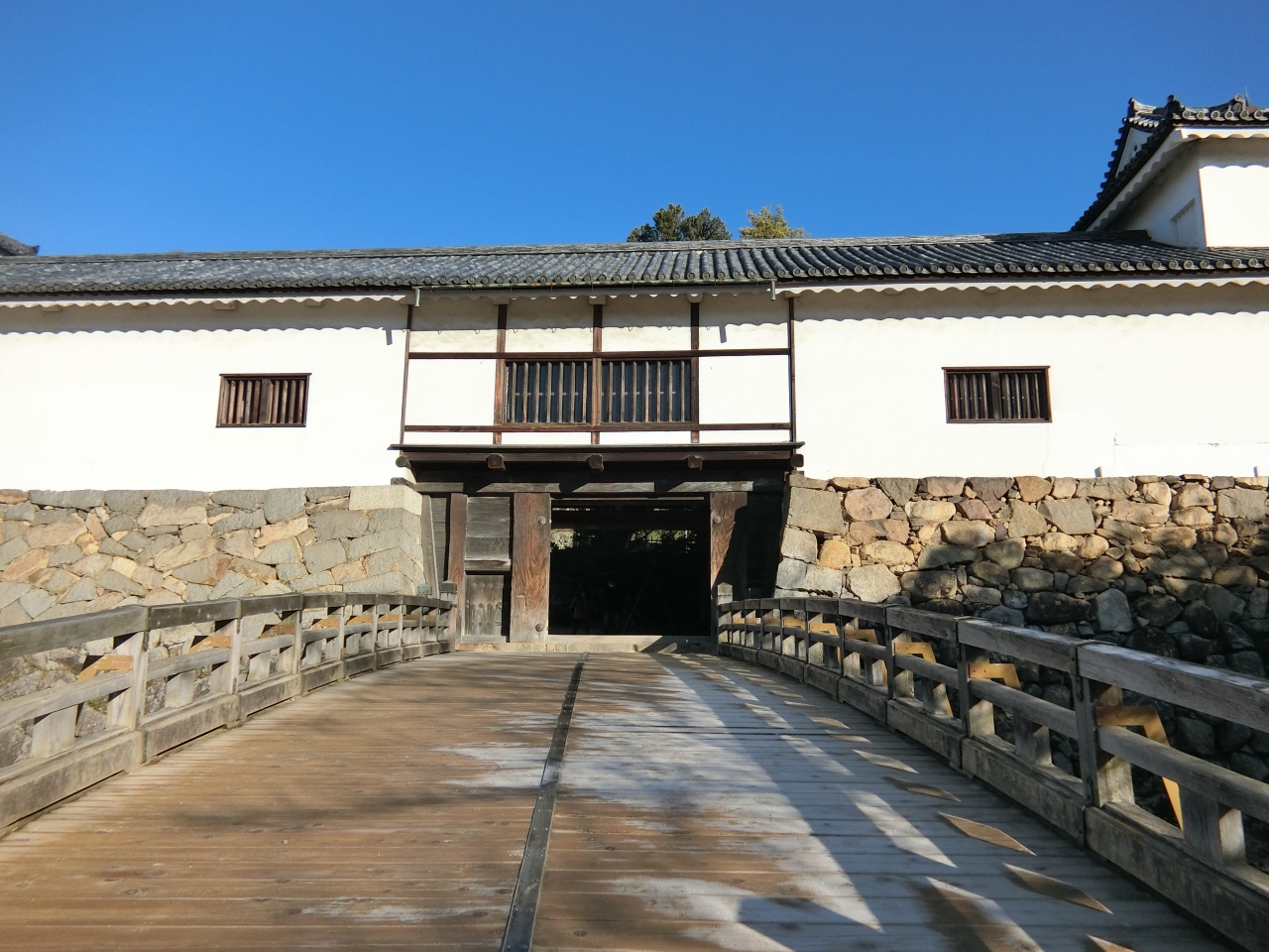 天秤櫓は、彦根城に向かって長い坂道を登り、廊下橋を渡るとあります。天秤櫓は石垣がしっかりした頑丈そうな櫓です。両端に荷物を下げた天秤みたいなのでこの名がつけられたようです。実際は左右対称ではないようですが、じっくり見ないとわかりません。