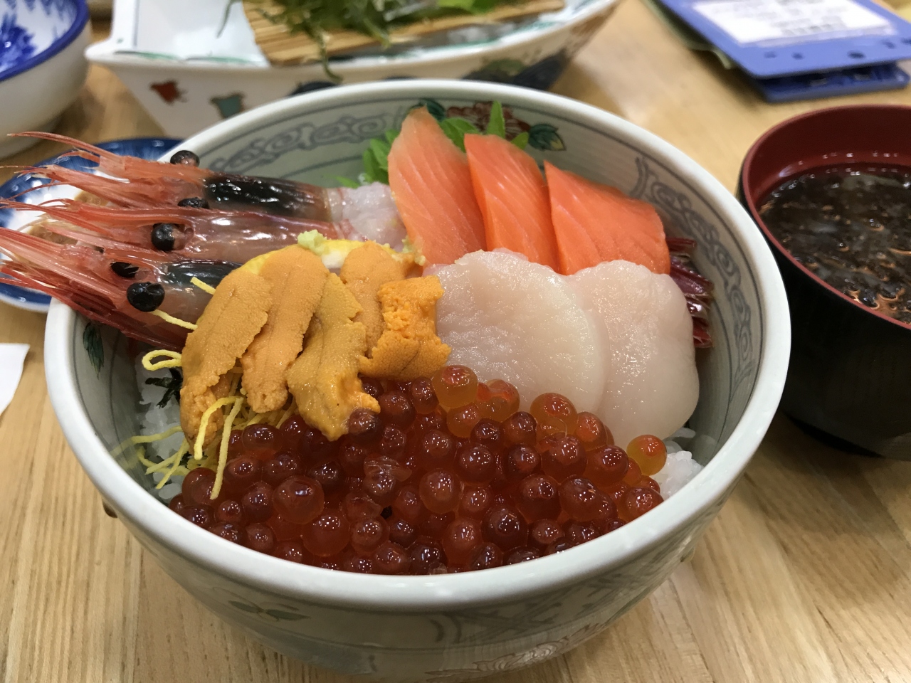 イカの活き造りが食べたくて朝市に行きましたが、2時くらいでしたので、閉店とのことで、営業しているこちらに入ってみました。1500円の海鮮丼を食べ、1200円のイカの活き造りをオーダーしました。前日、居酒屋でイカの入荷がないため、食べられませんでしたが、新鮮な透き通ったイカのお刺身が食べられて満足でした。足は、焼いていただきました。海鮮丼も、値段以上のネタで、美味しかったです。
